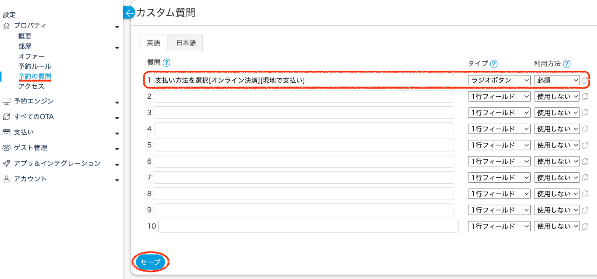 ①プロパティ > 予約の質問で以下のように設定