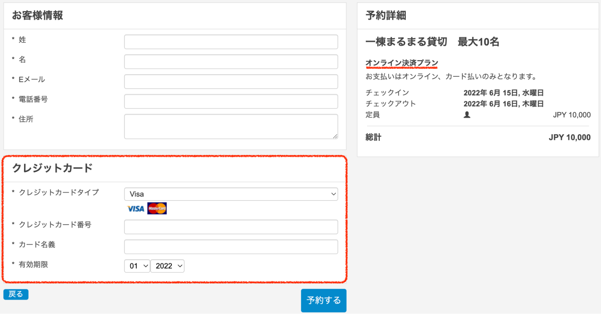 事前決済プランは、予約確認画面でカード情報の入力が求められます。