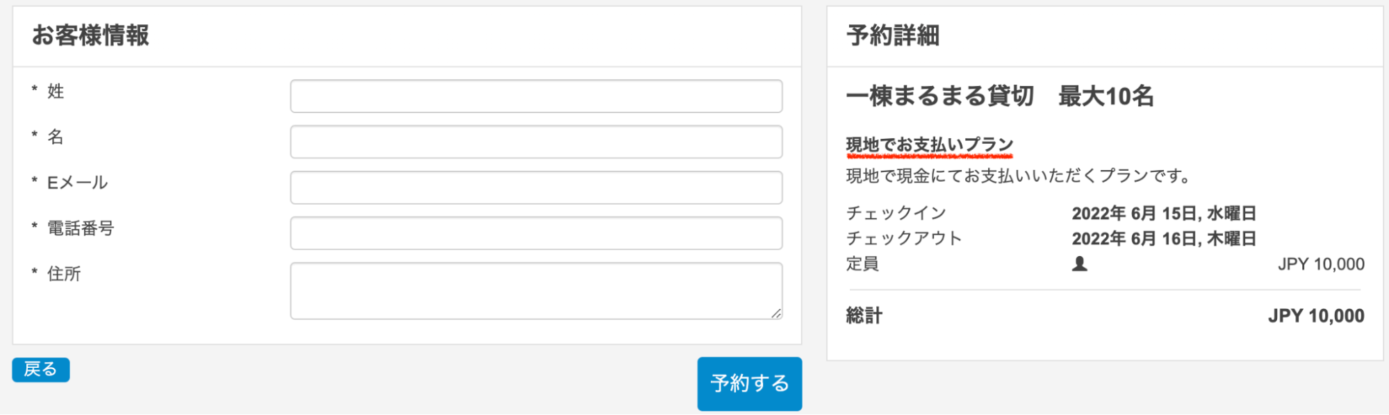 現地決済プランは、カード情報の入力なしで予約が可能です。