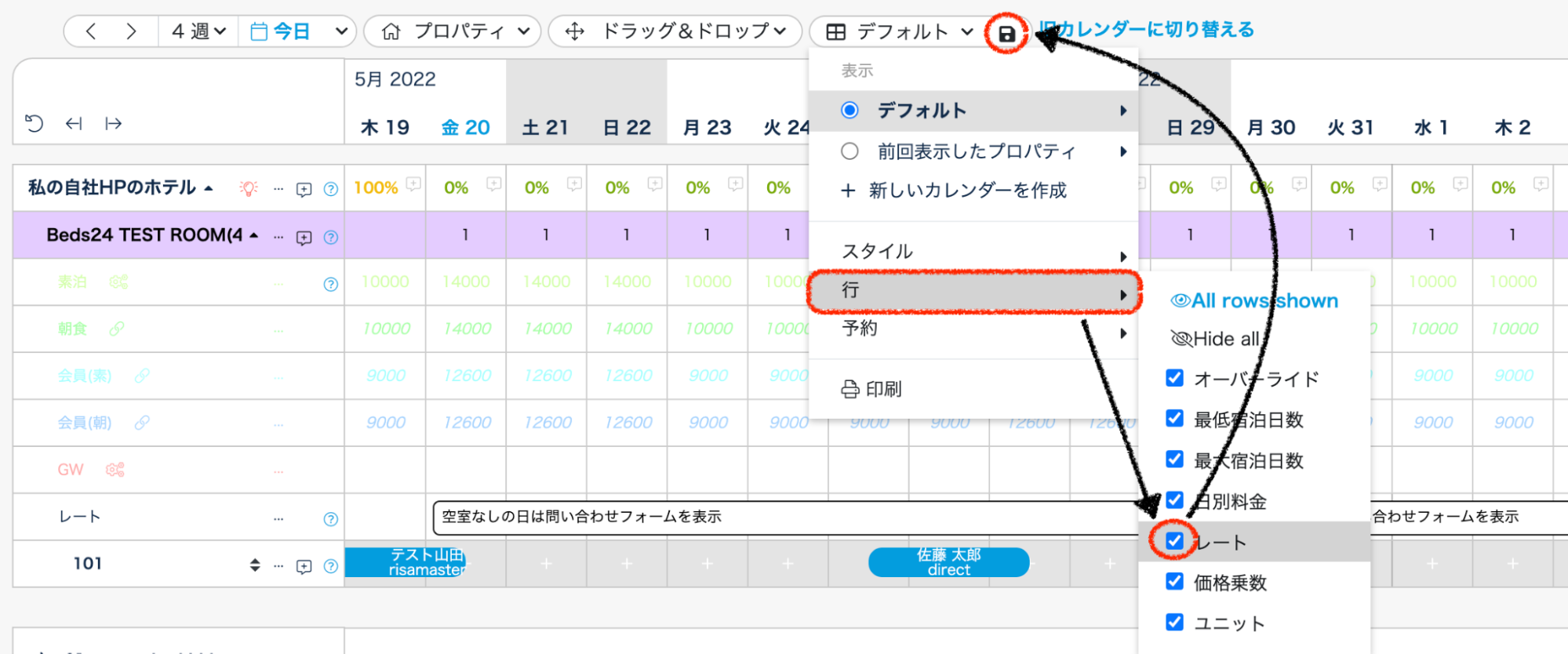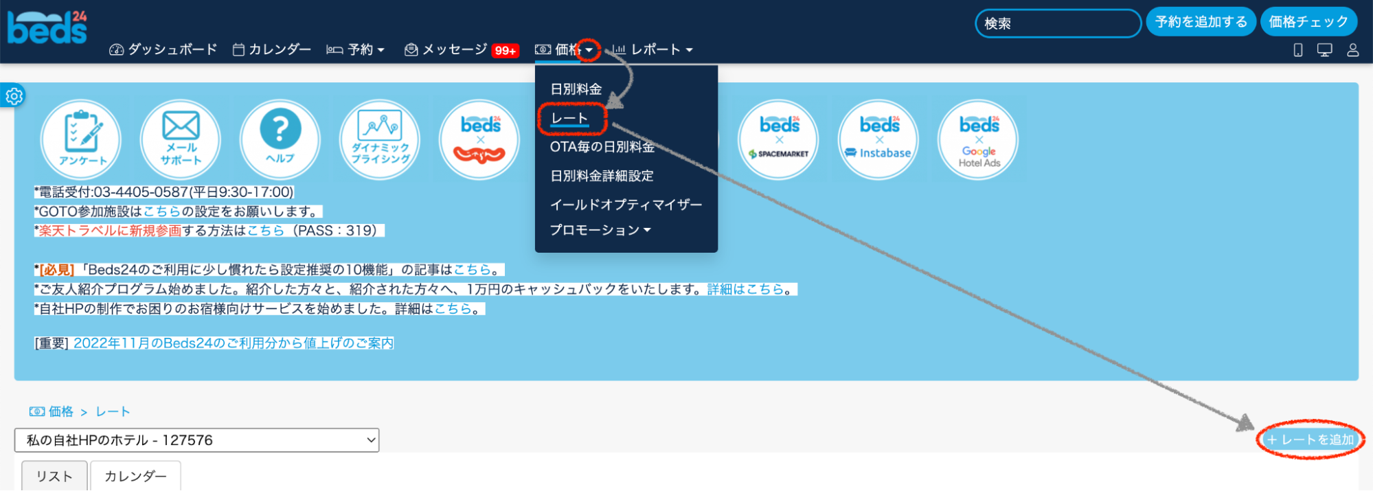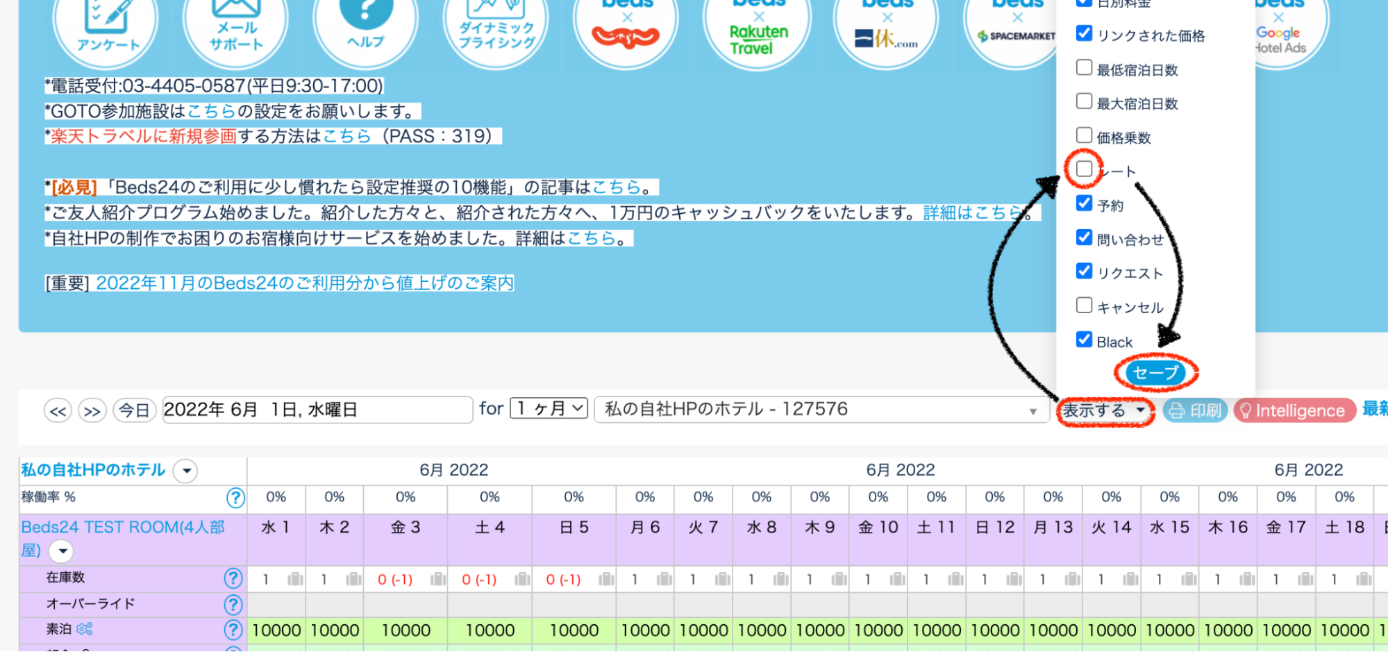 Beds24予約エンジンは、以下画像の赤枠で日付を指定する場合、