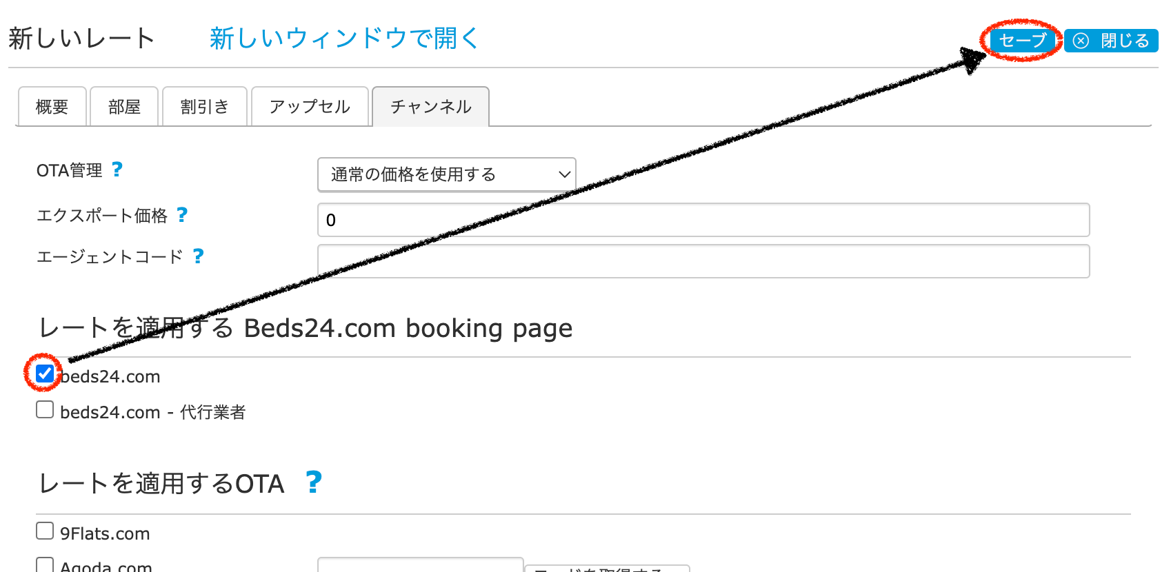 ⑦『チャンネル』タブで『beds24.com』にチェック