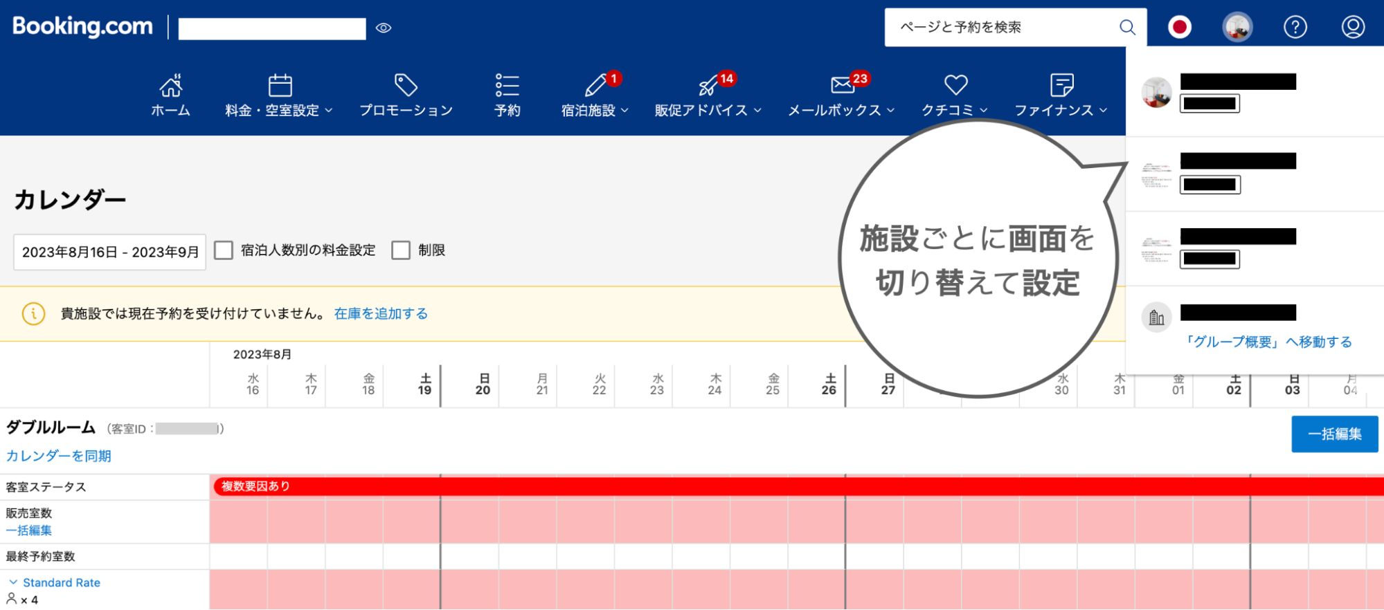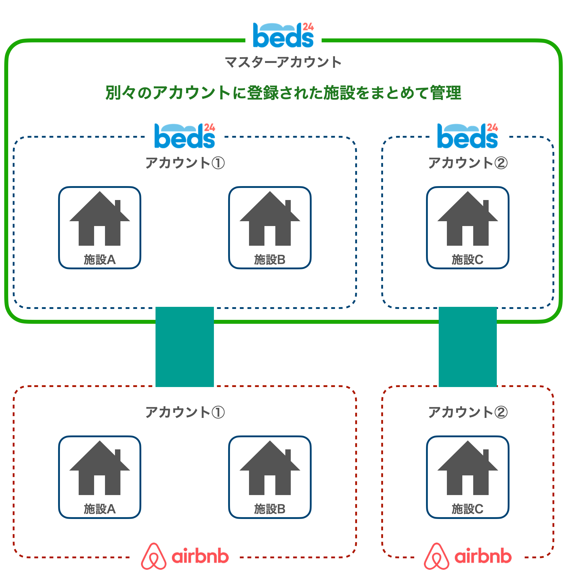 Beds24は、複数施設を1アカウントだけで一括管理することができます。