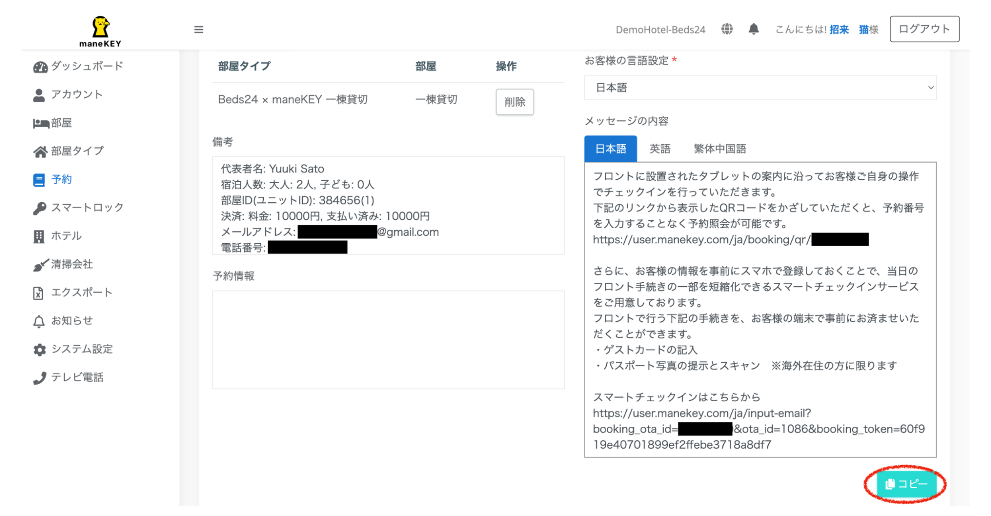 maneKEY管理画面からメッセージをコピーし、ゲストに送信しましょう。