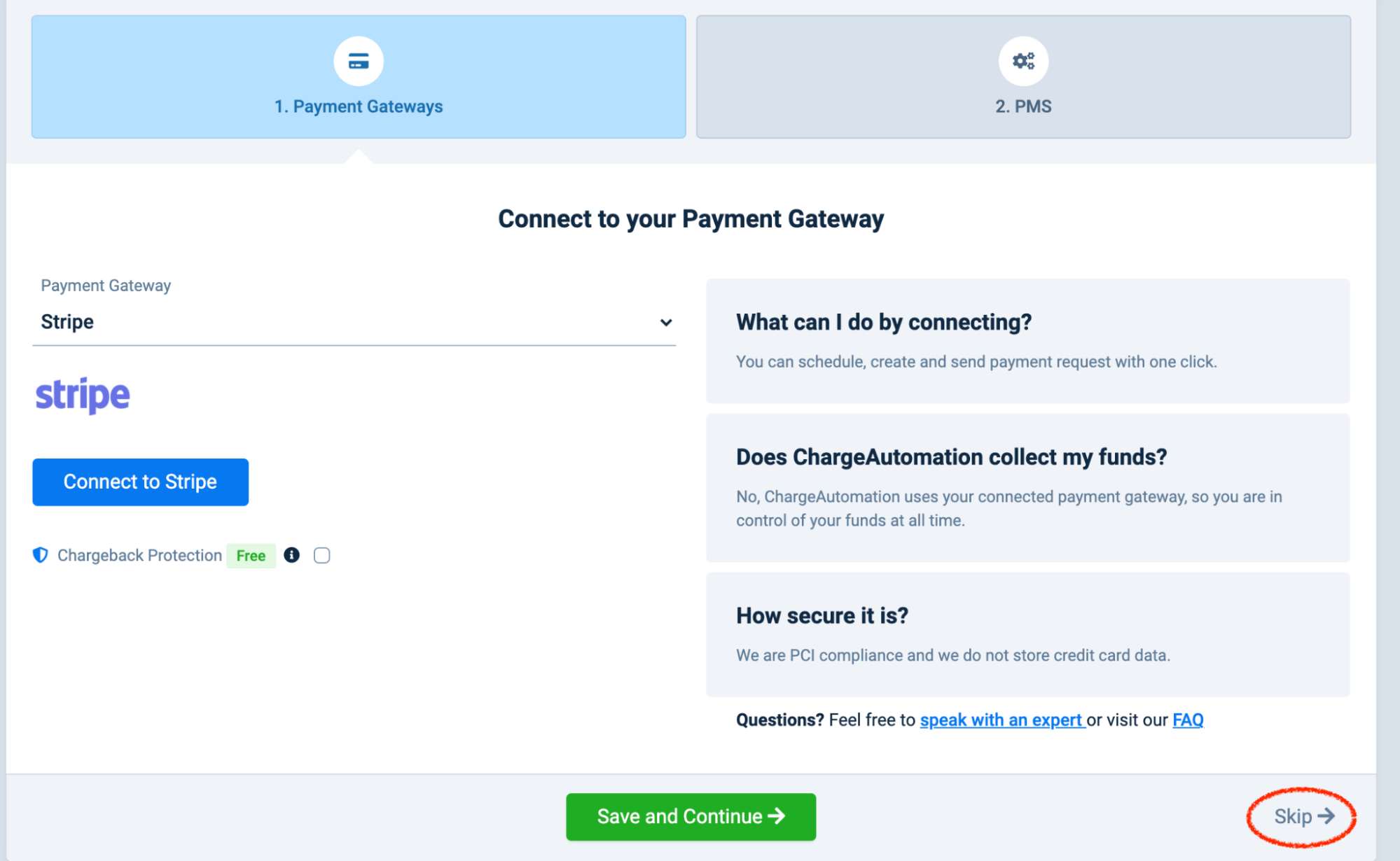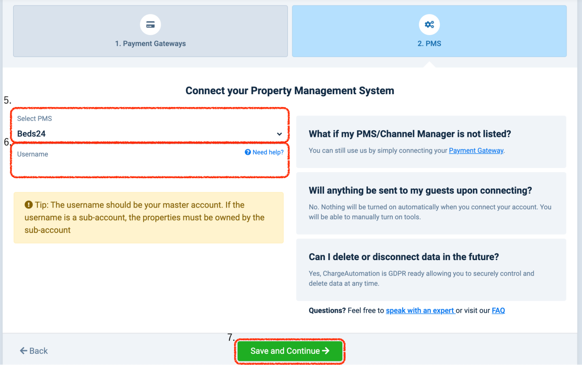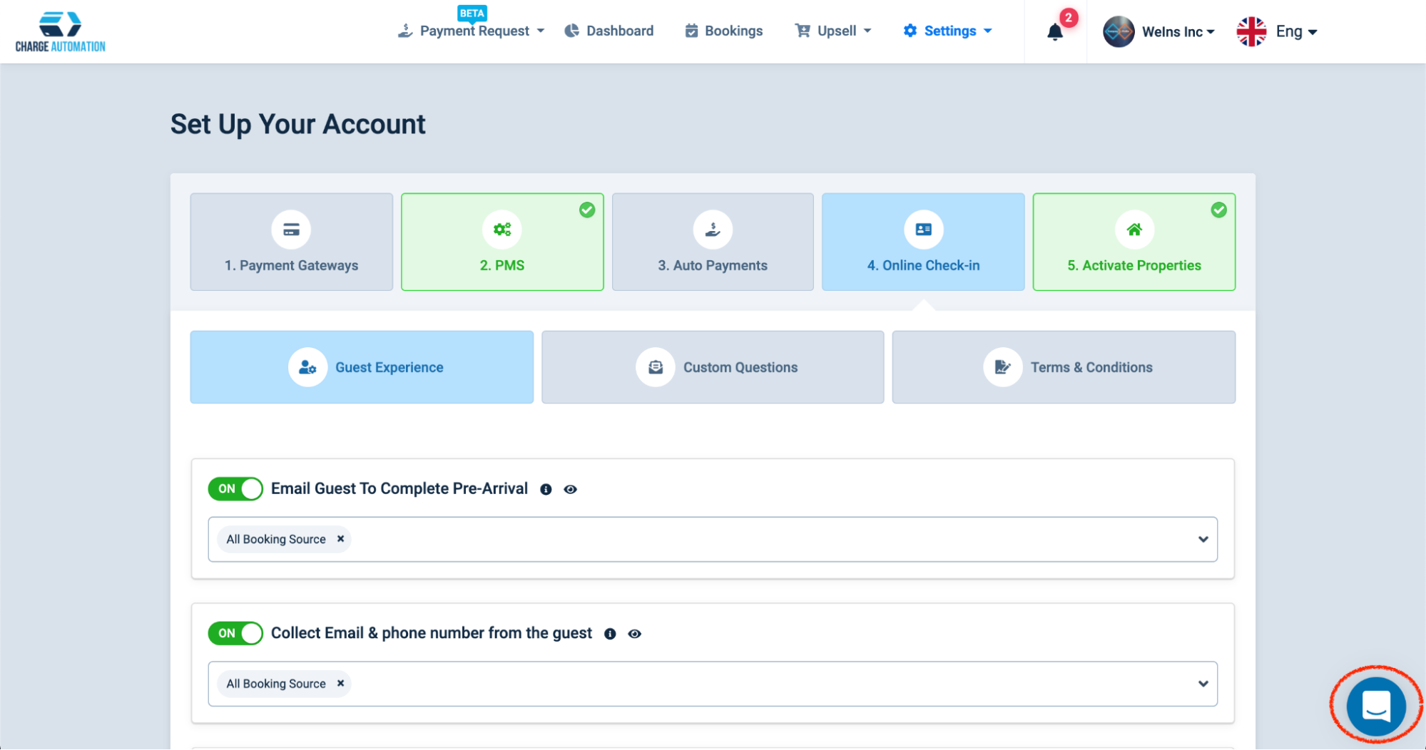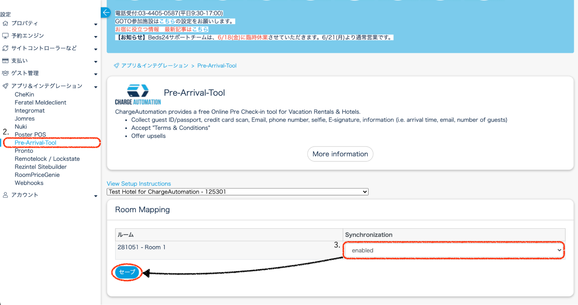 4.ChargeAutomationの管理画面で、Settings > Account Setup > 2.PMSを開きます。