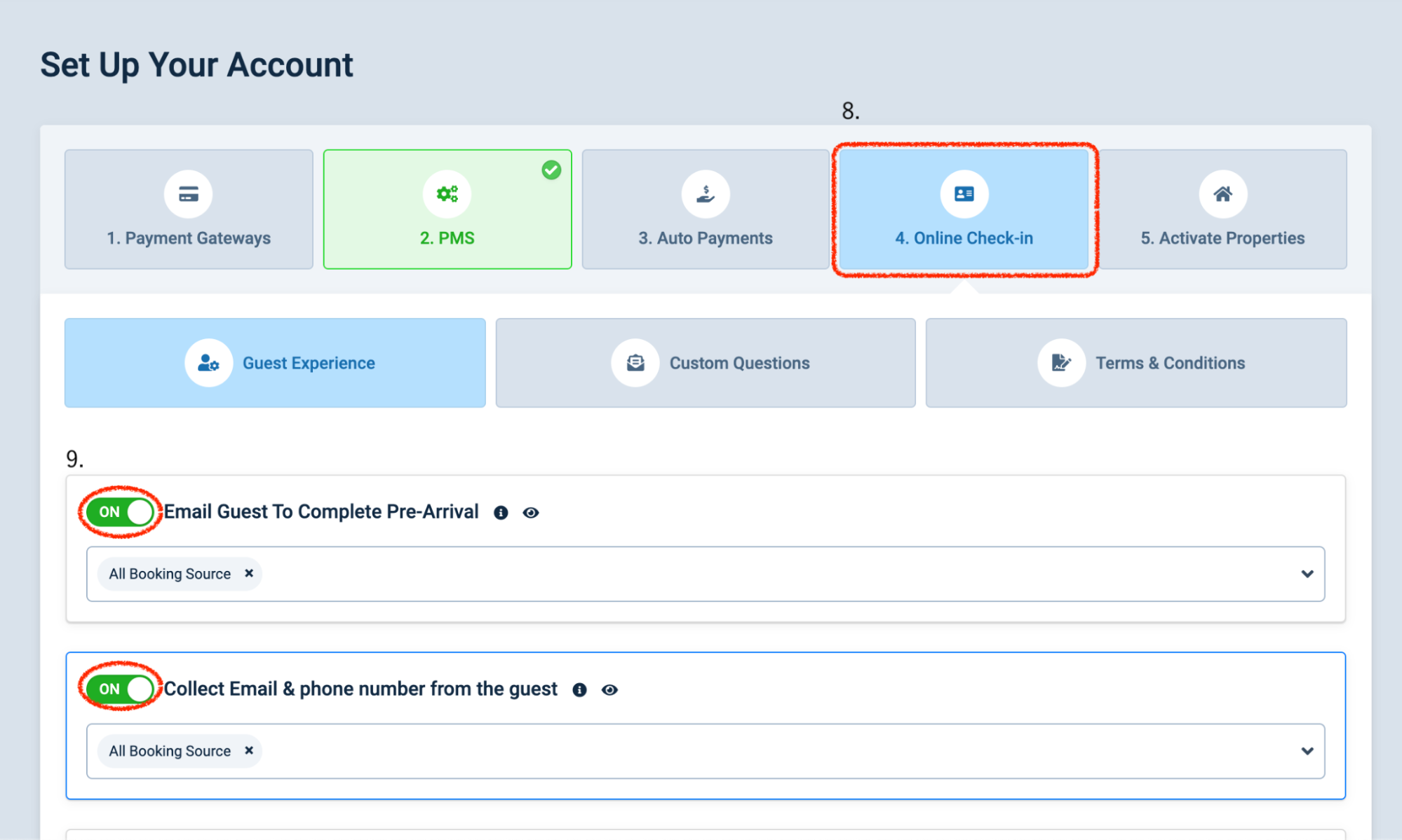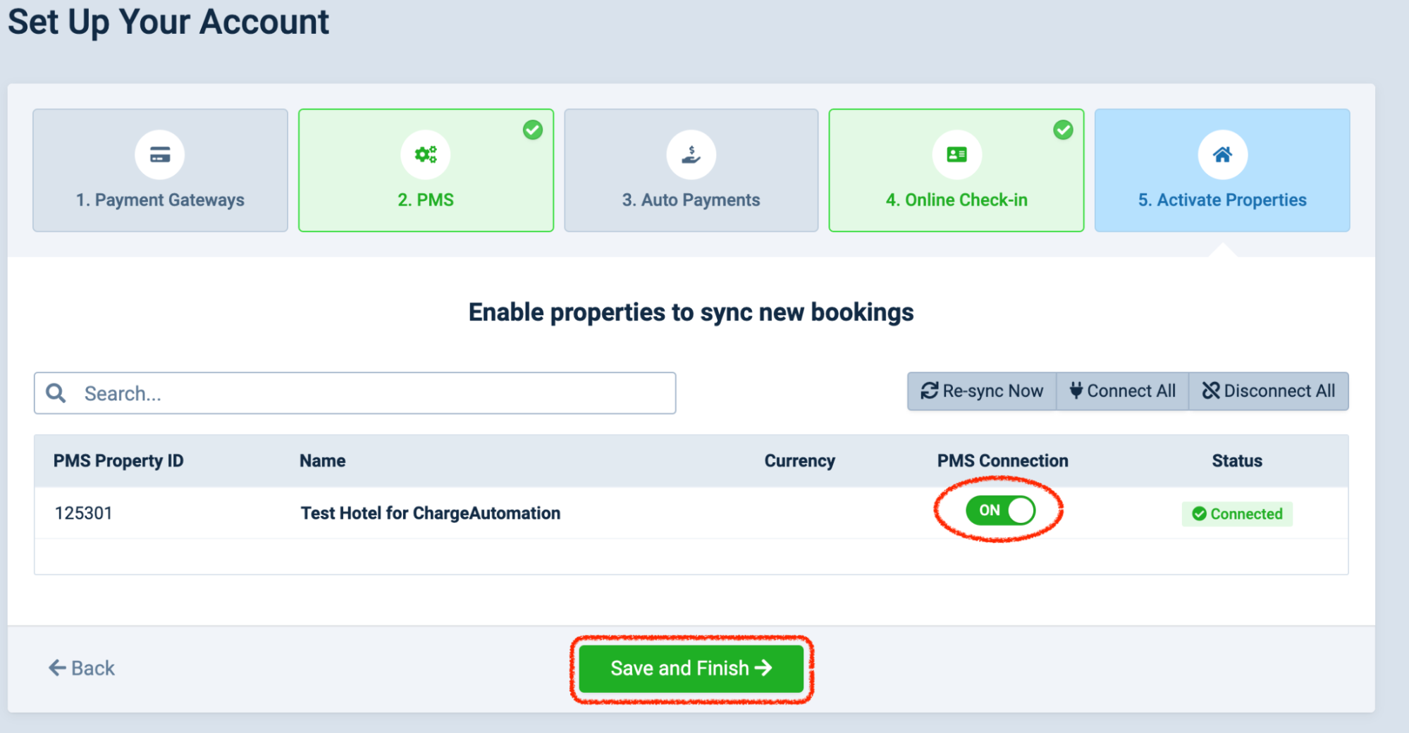 11.ChargeAutomationのSettings > Account Setup > 5.Activate PropertiesでPMS Connectionを「ON」にして「Save and Finish」をクリックします。