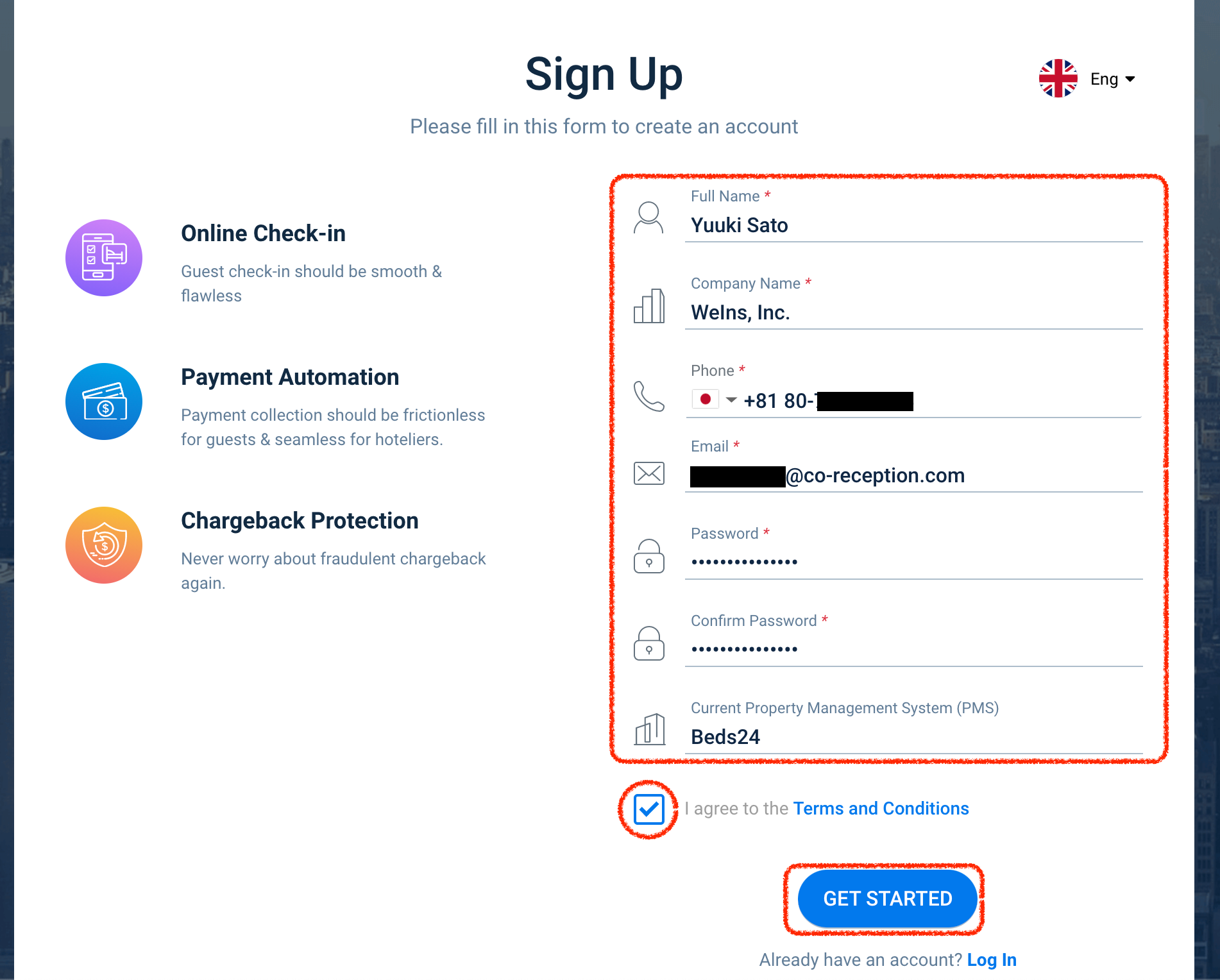 ・情報を入力し、チェックを入れて「GET STARTED」をクリックします。