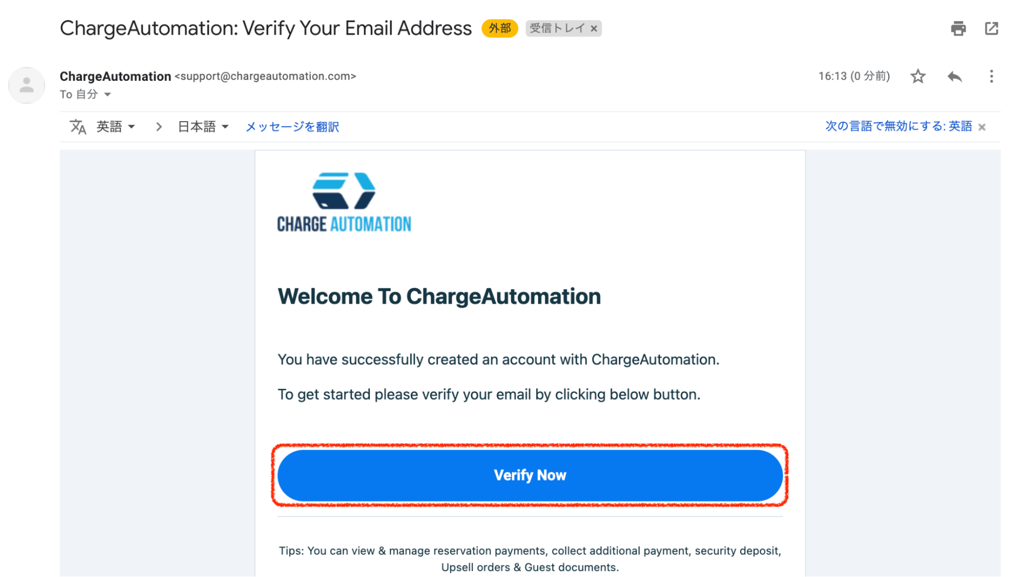 ・ChargeAutomationから届いたメールの「Verify Now」をクリックします。