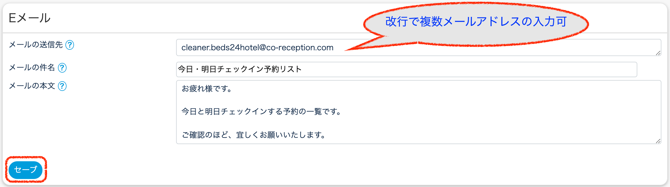 4.『メールの送信先』に送信先メールアドレスを入力し、『メールの件名』と『メールの本文』を入力してセーブします。
