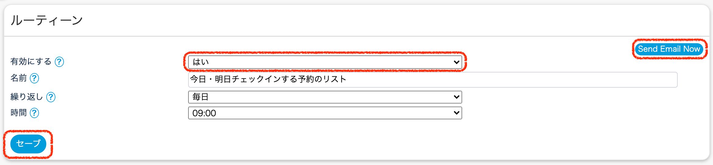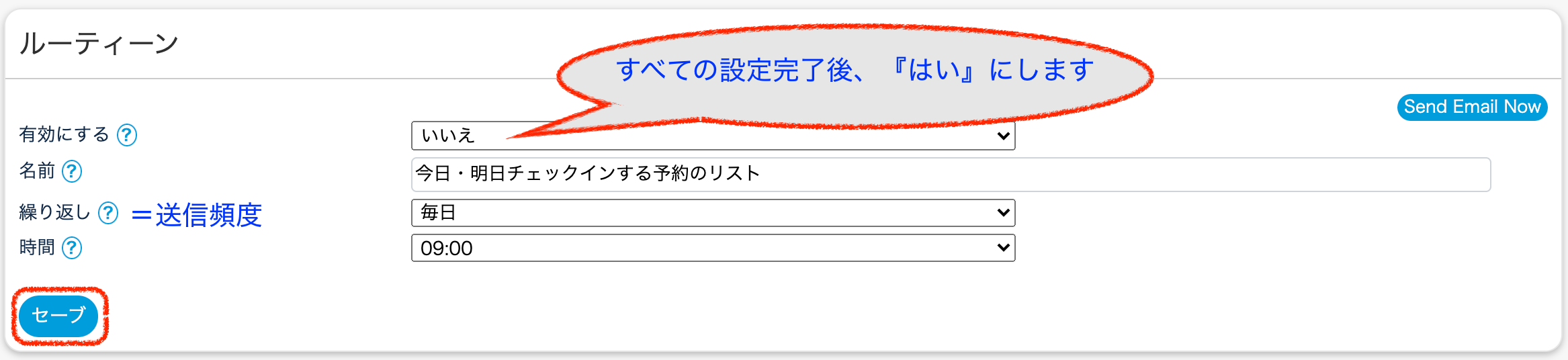 画面右上の『Send Email Now』をクリックし、問題なくリストが送信されたら『有効にする』を『はい』にしてセーブします。