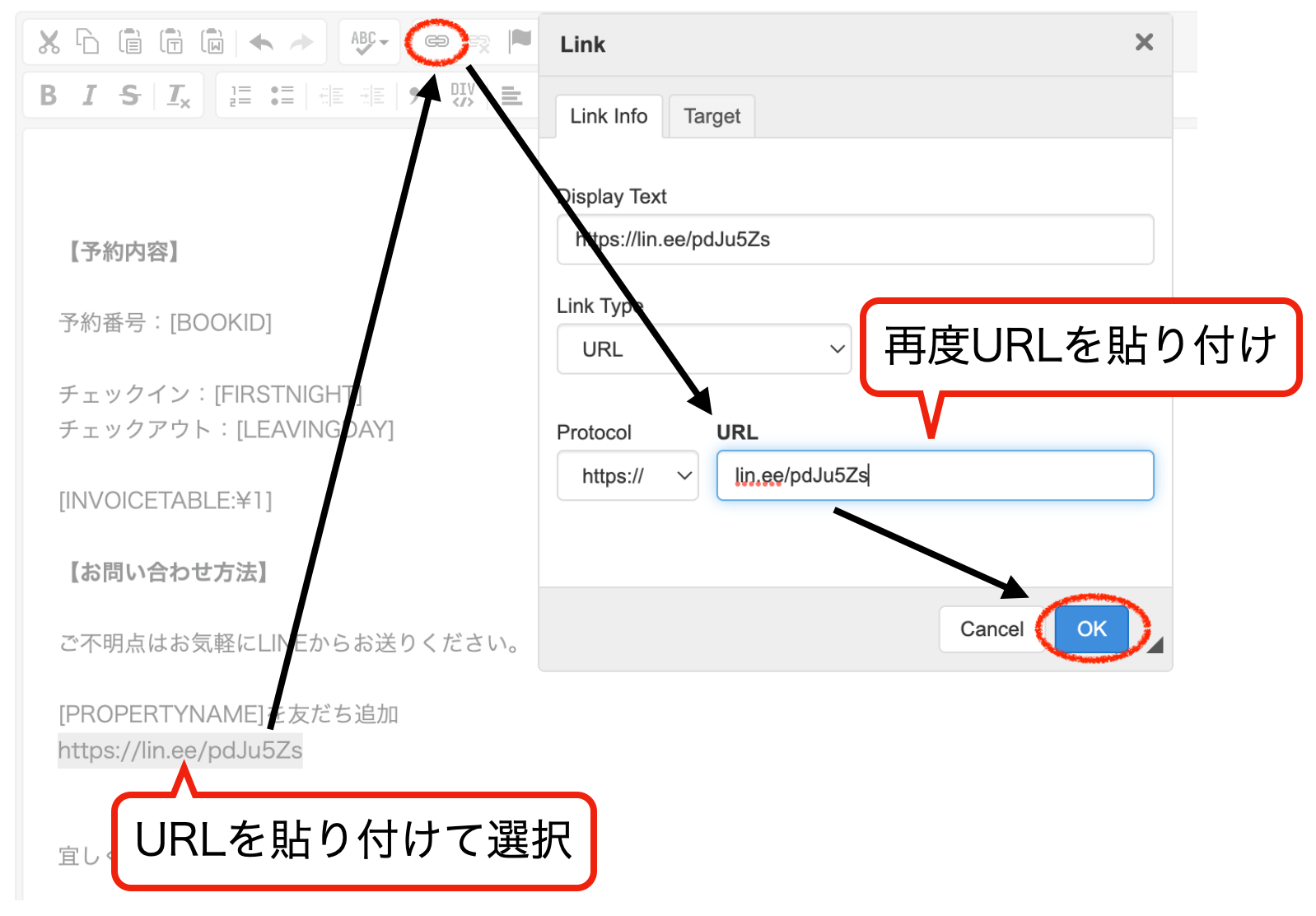 ②本文にURLを貼り付け、リンクを挿入し、セーブ