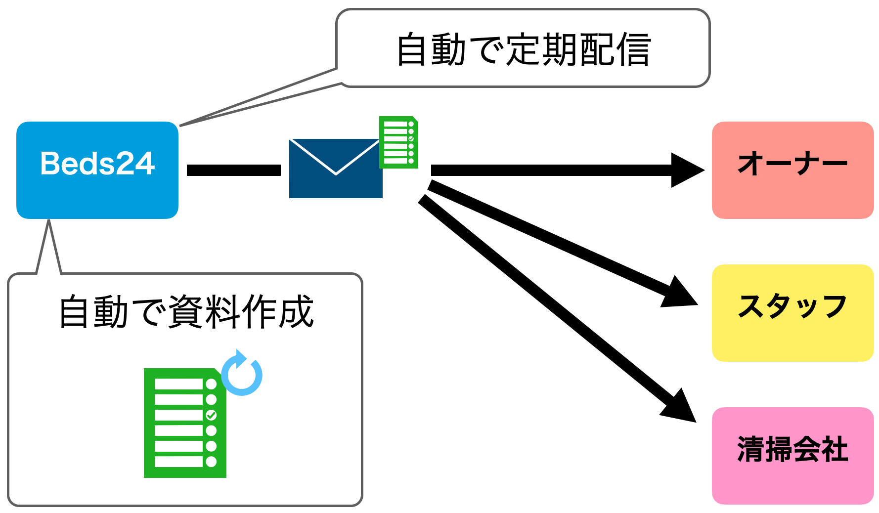 定期的な資料提出やデータ共有は、Beds24で自動化できます。