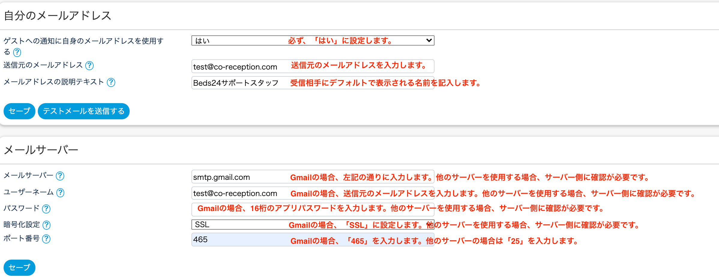 以下の設定をすると、自動送信メールの送信元がBeds24のサーバーからお客様のサーバーに切り替わり、送信元メールアドレスがご施設様のアドレスになります。