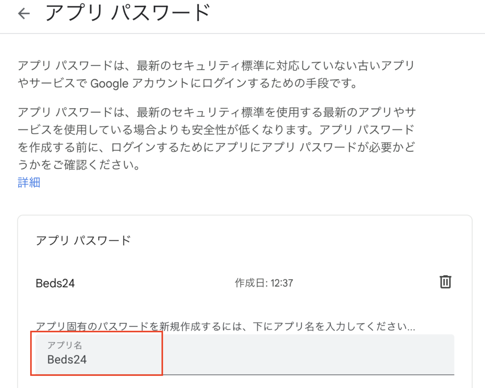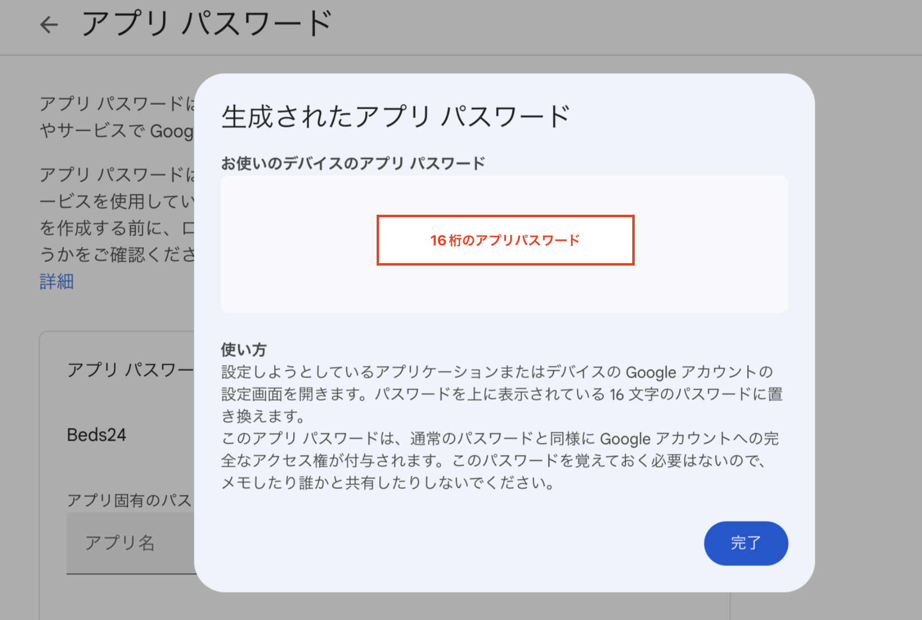 Beds24と連携する際に使用します。以下のリンクよりアプリパスワードを生成し、16桁のパスワードを忘れずに控えてください。