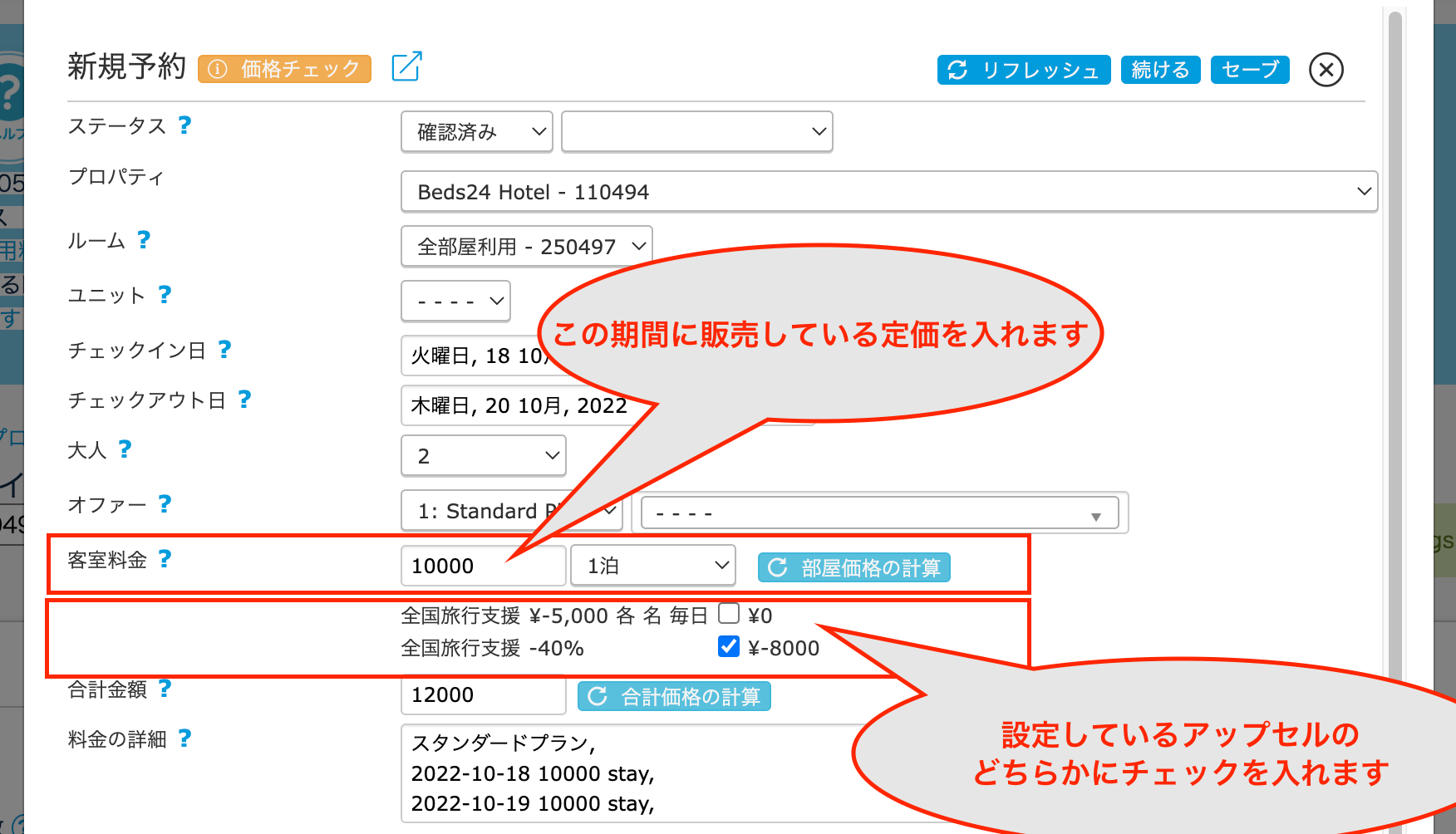 お電話やEmailなどで直接ご予約を受けられた場合でも、予約情報に2,で設定したUpsellを適用させることが可能です。※必ず上記2でご案内しているUpsellの設定をお済ませください。