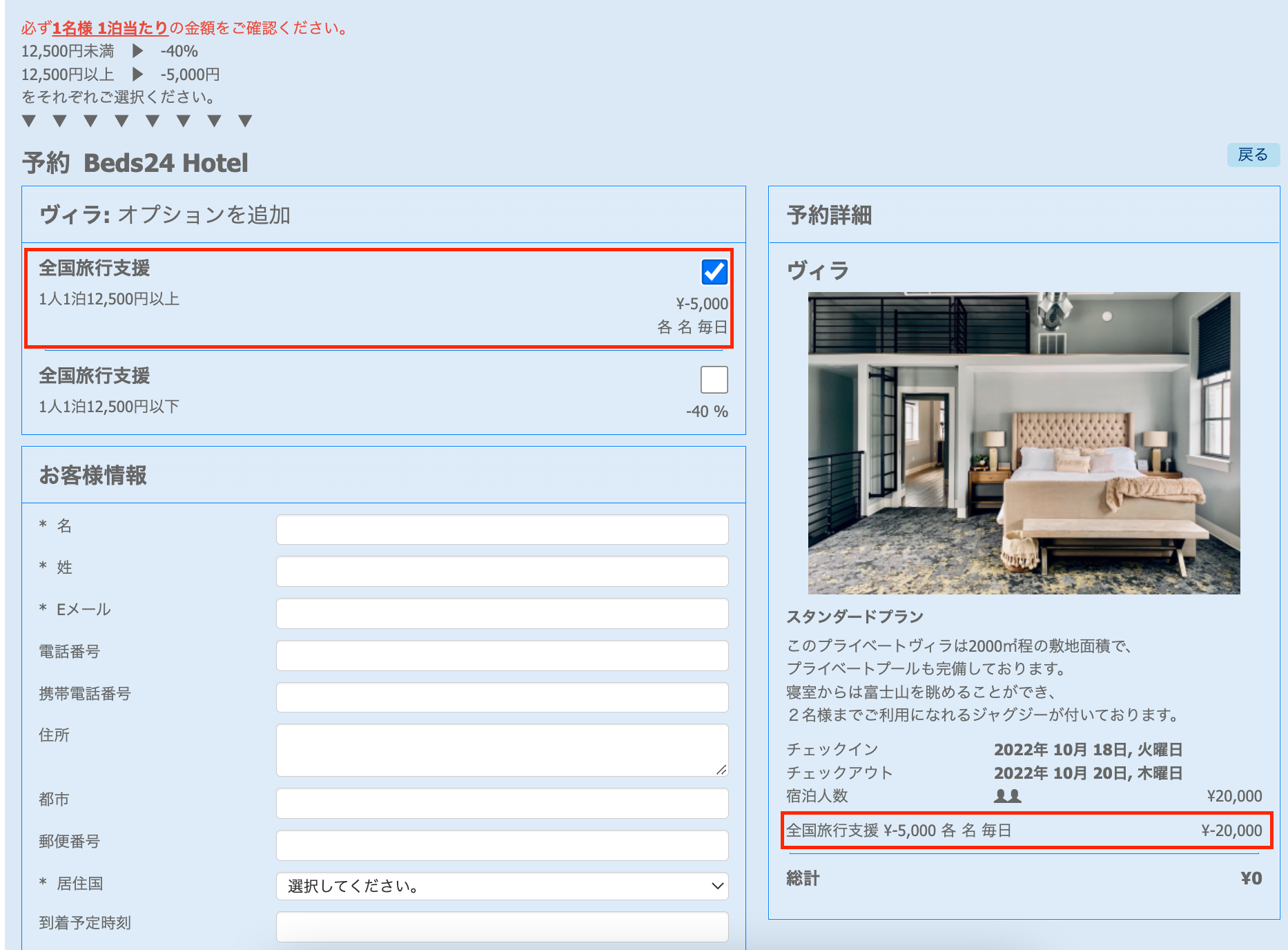 例えば1泊1名12500円以上にも関わらず、割引-5000円ではなく、-40%を選択してしまう、といった状態です。