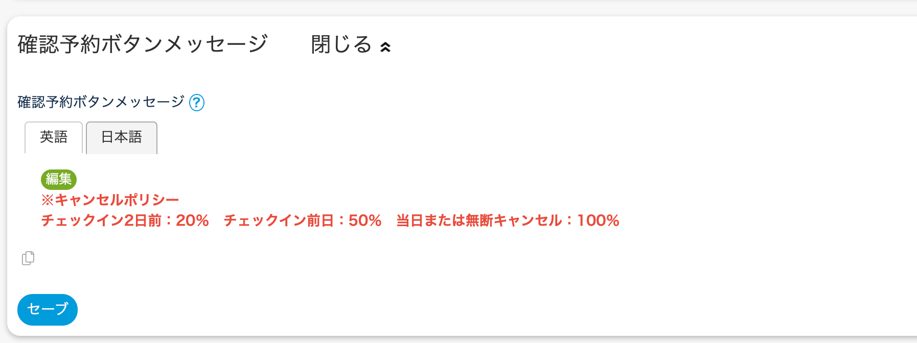 2.予約エンジン > プロパティ予約ページ > コンテンツ >確認予約ボタンメッセージ へ宿のキャンセルポリシーを入力してセーブします。