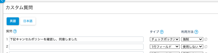 設定 > プロパティ > 予約の質問の「カスタム質問」を以下のように設定します。
