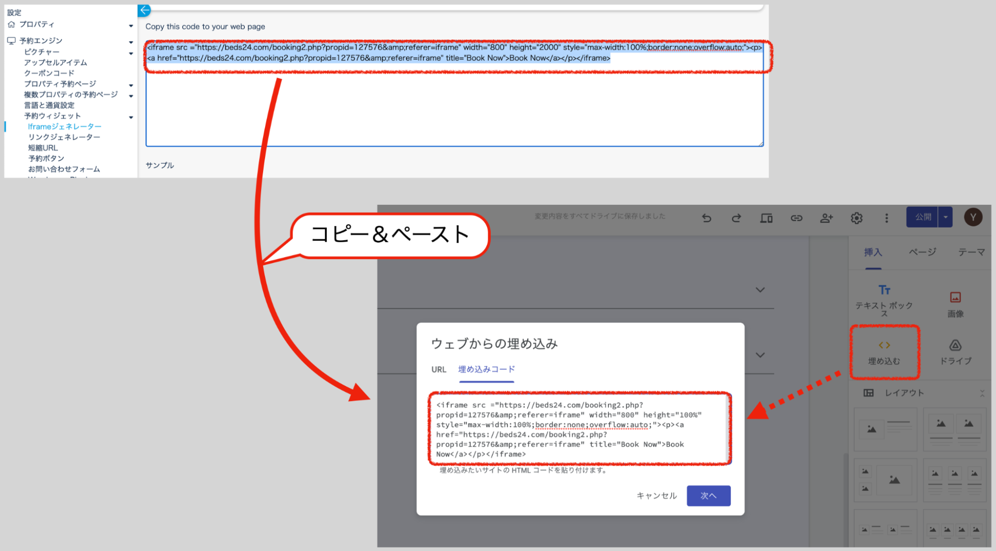 ④Beds24からiframe(1行のコード)をGoogle サイトにコピペ