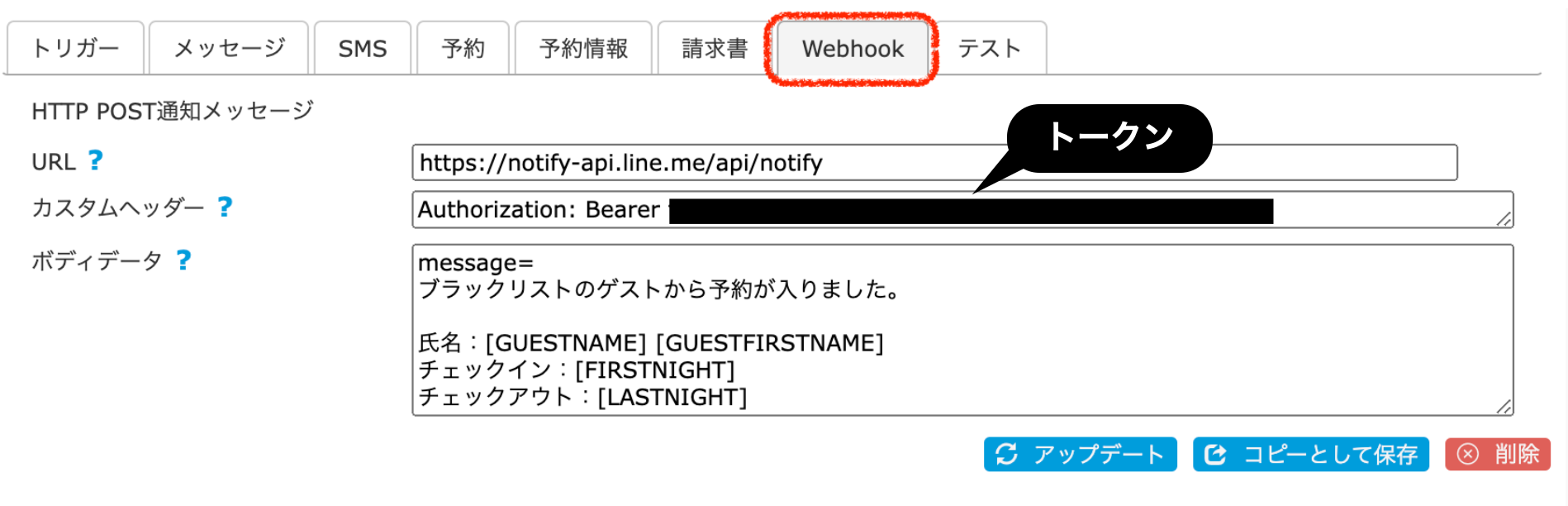 LINE通知を設定する場合は、Webhookタブを編集してください。