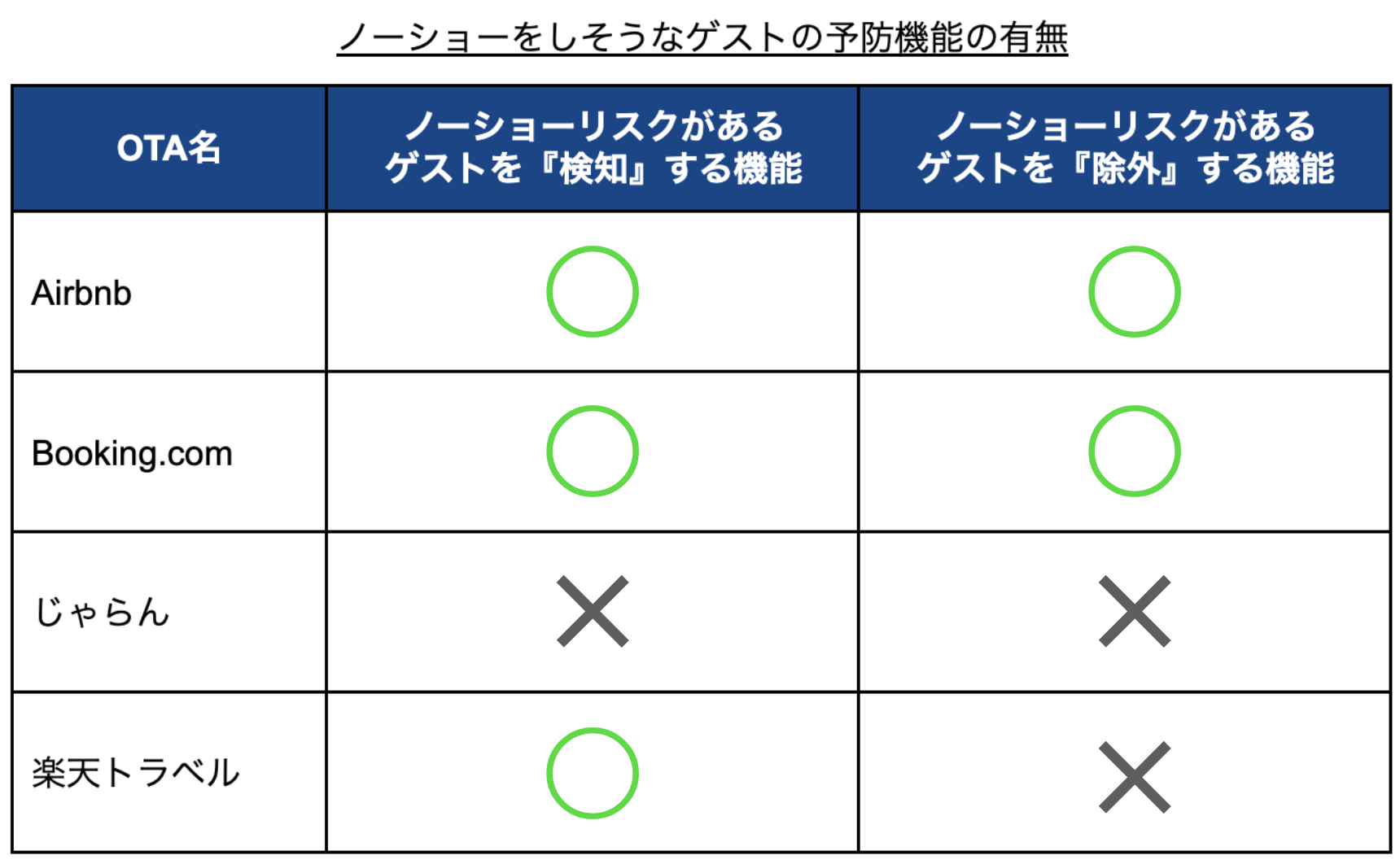 各OTAで、ノーショーリスクがあるゲストの検知・除外機能は異なります。