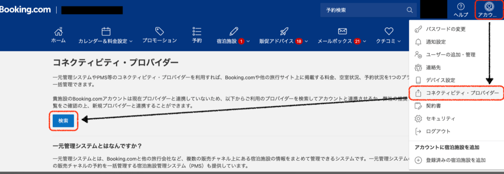 ①Booking.comの管理画面 > アカウント > 「コネクティビティ・プロバイダー」に進みます。