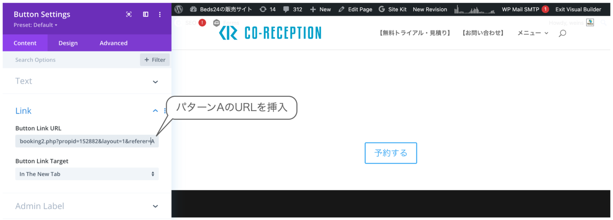 ①通常の予約ボタンにパターンAのURLを挿入してセーブ