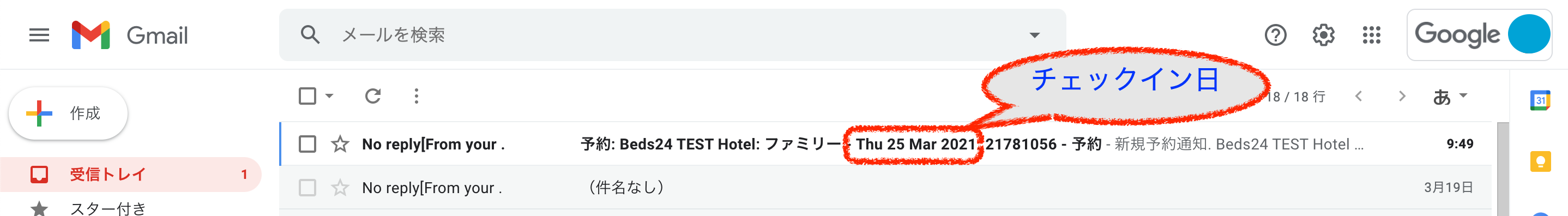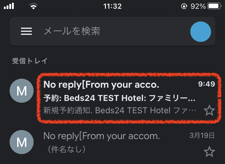 Beds24のデフォルトの予約通知の件名には、チェックイン日が明記されています。