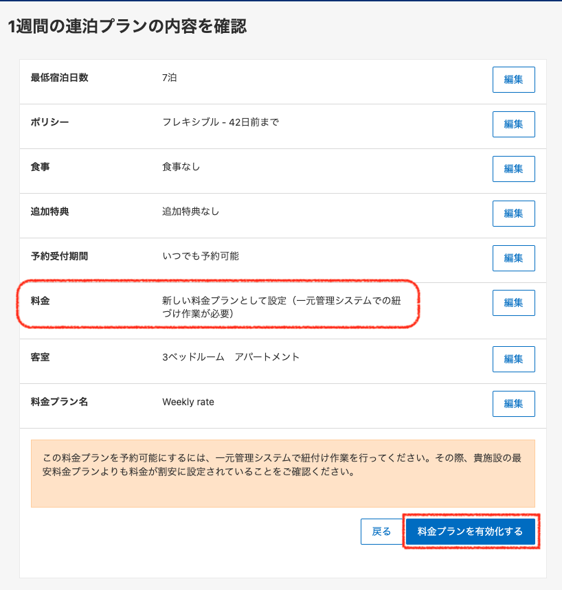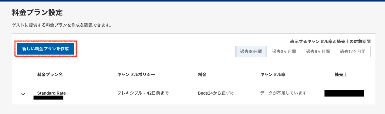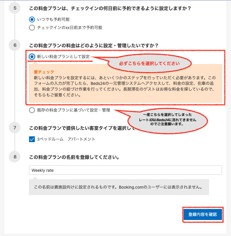 この時、「既存の料金プランに基づいて設定・管理」を選択し作成してしまうと、レートIDがBeds24へ流れてきませんのでご注意願います。