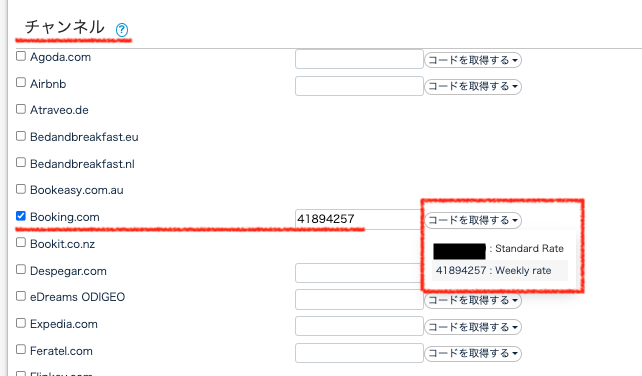 ・チャンネル:Booking,comにチェックを入れ、「コードを取得する」とクリックすると