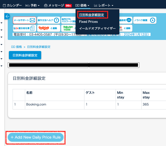 価格>日別料金詳細設定のページまで進み、「Add New Daily Price Rule」をクリックして日別料金の行を追加します。
