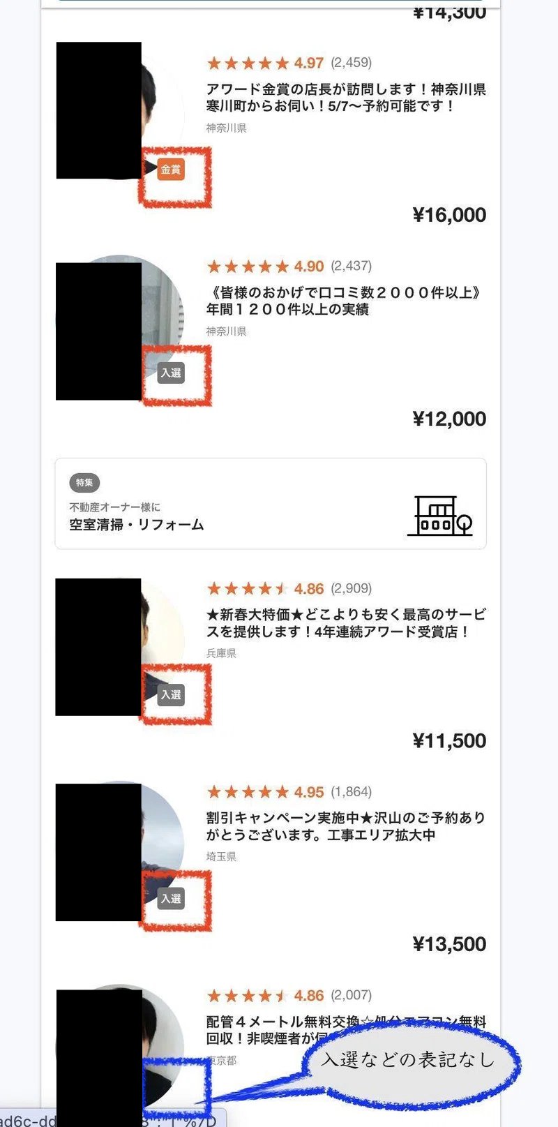 「入選」、「金賞」、「銀賞」などのラベルは、業者の質の高さを示しています。