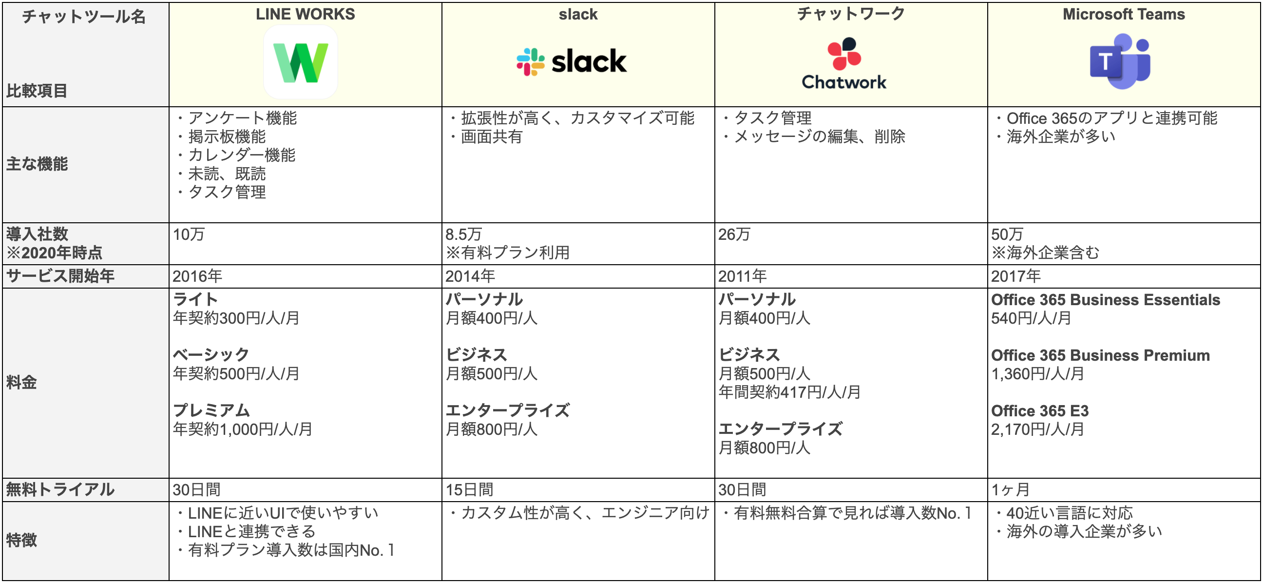 国内シェアが多い4つのビジネスチャットツール比較表です。