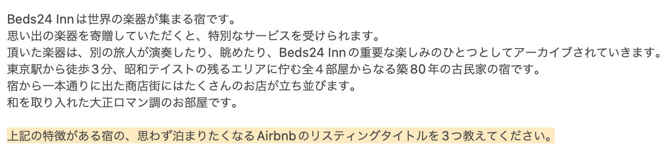 Airbnbのリスティング名(=タイトル)。