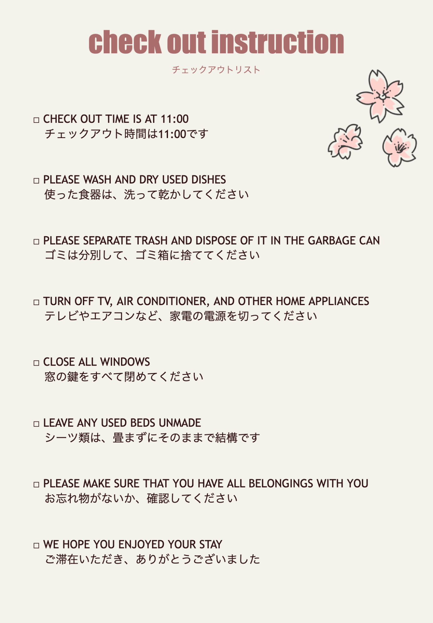 チェックアウト時にゲストにやってほしいことを、リスト化しましょう。