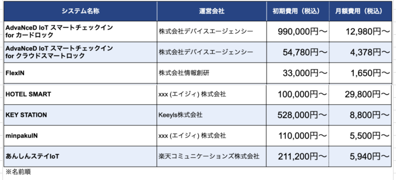 以下は、弊社が各社に問い合わせた概算の費用です。