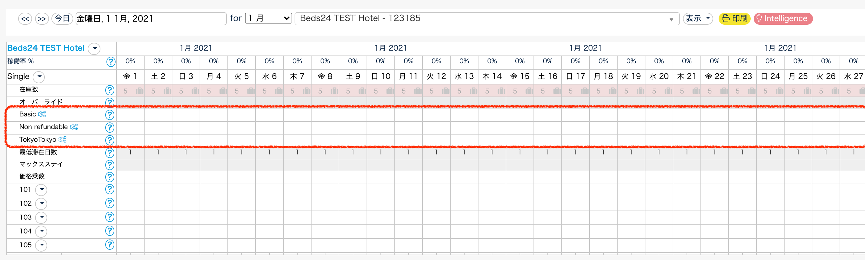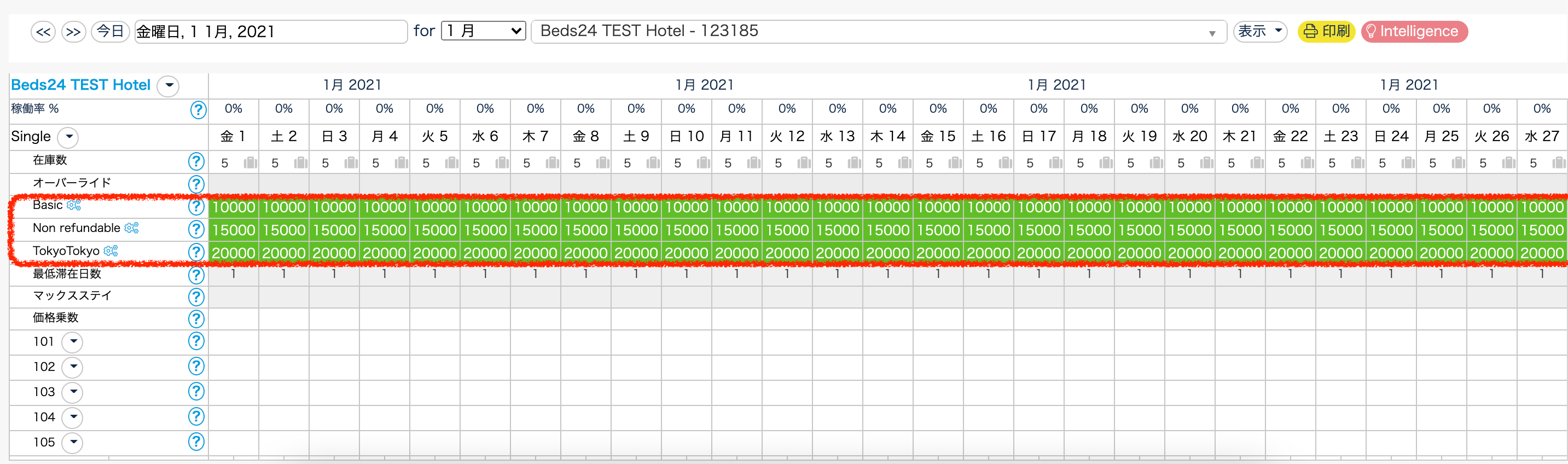 4.Beds24のカレンダーを確認して、正しく料金が反映されているかどうか確認してください。