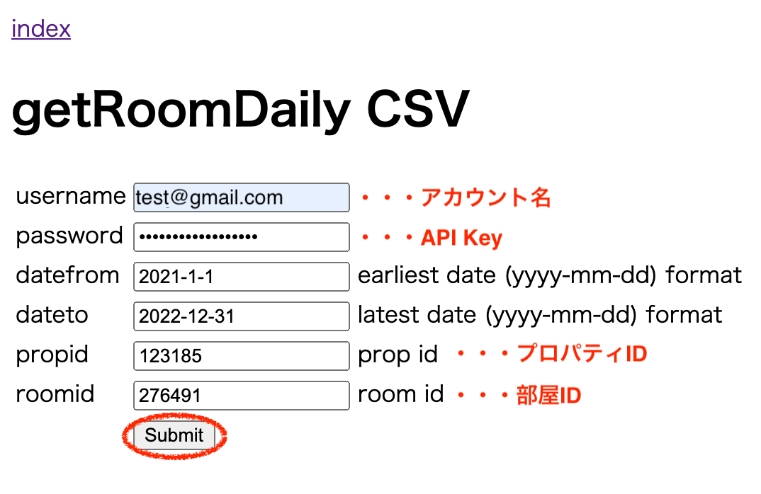 1.https://www.beds24.com/api/csv/getroomdailycsvにアクセスし、各IDなどを入力し「Submit」ボタンを押すと、CSVをダウンロードすることができます。