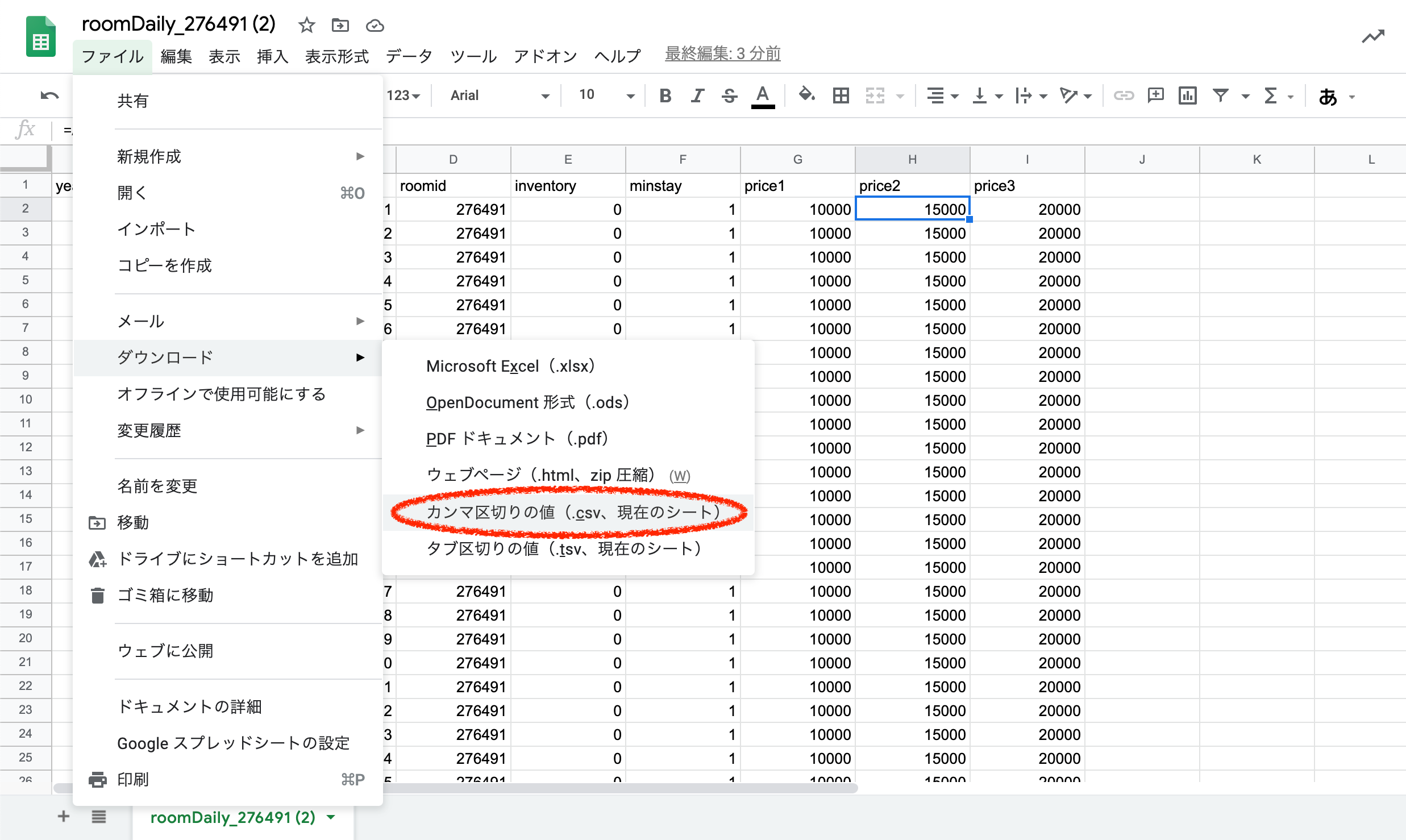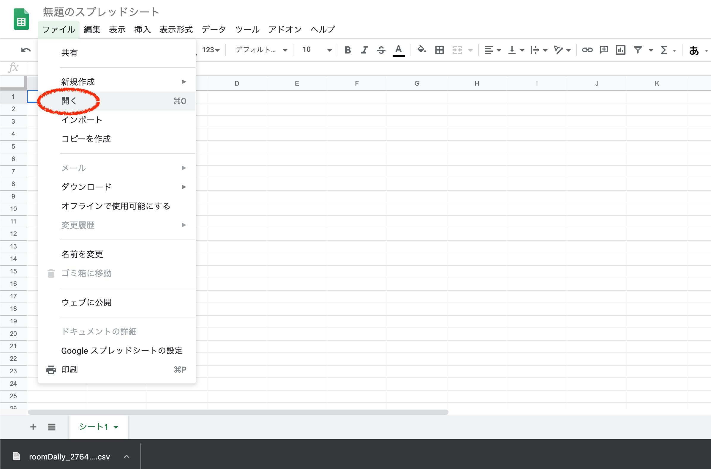 2.ダウンロードしたCSVをスプレッドシートで開きます。