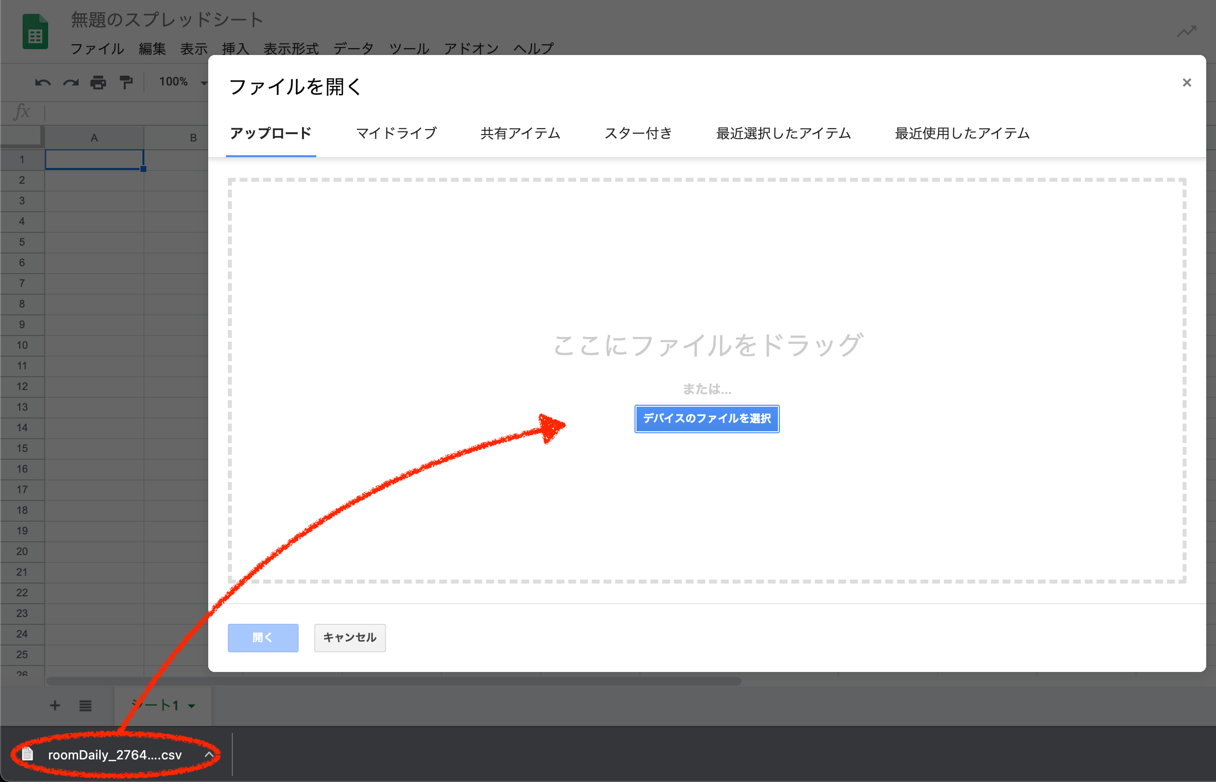 3.ドラッグ&ドロップ、または「デバイスのファイルを選択」からCSVファイルを選択します。