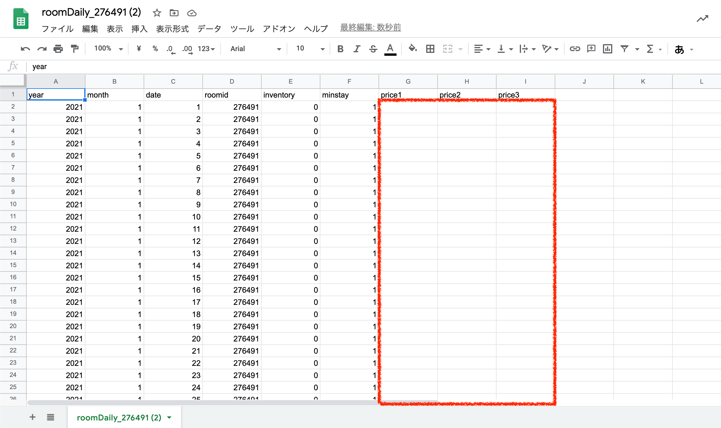 4.「price」の列に価格を入力します。※今回は未設定の期間を選択してダウンロードしたため、赤枠内は空欄になっています。Beds24のカレンダーに価格が入っている期間を指定してダウンロードした場合は、赤枠内には既に料金が入力されています。
