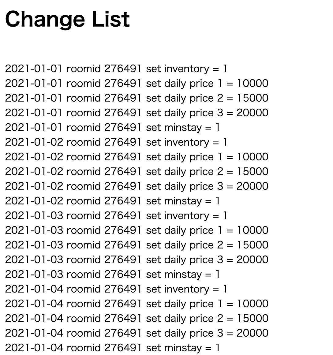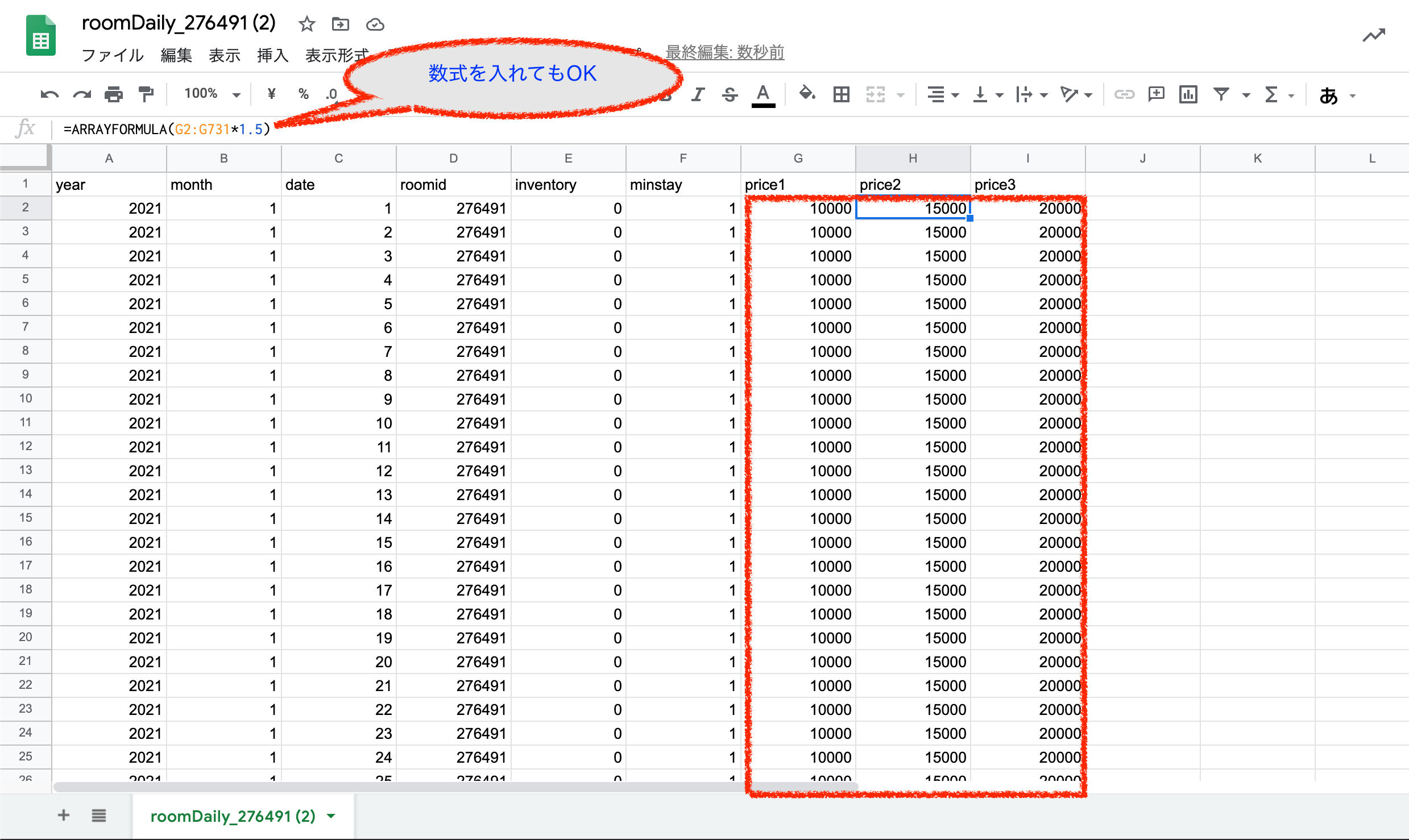 ※シートの「price」列は、Beds24で設定している日別料金の数と同じ数になります。