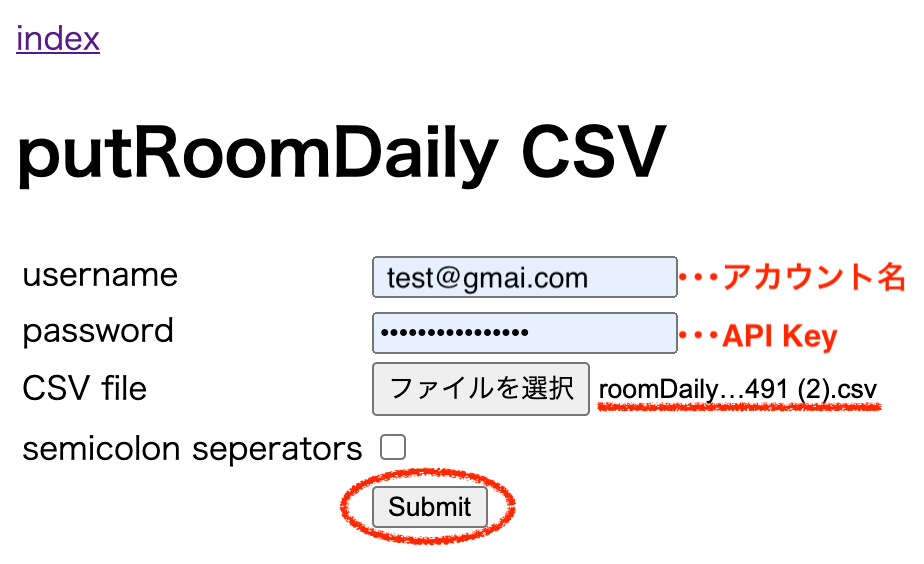 2.https://www.beds24.com/api/csv/putroomdailycsvにアクセスし、各IDなどを入力し「Submit」ボタンを押すとBeds24に価格がアップロードされます。