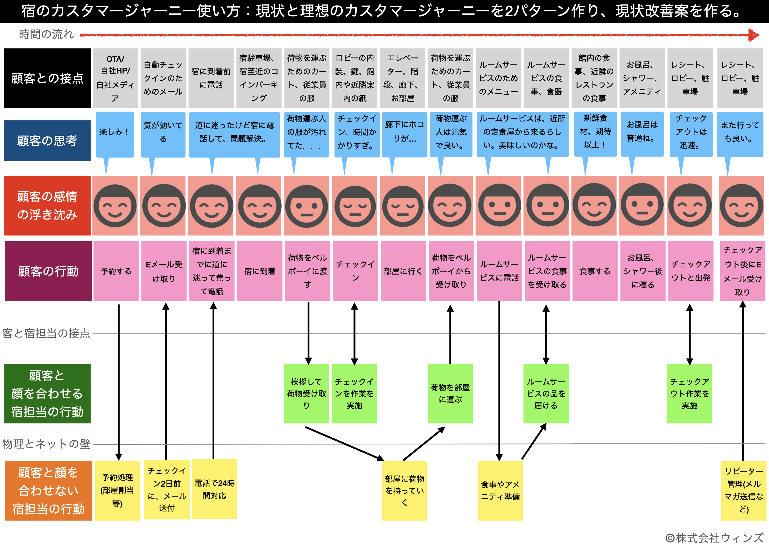 こちらの画像のデータは以下から雛形をダウンロード可能です。皆様の宿向けにカスタマージャーニーを作成する際に、ダウンロードして編集してご利用いただければ幸いです。