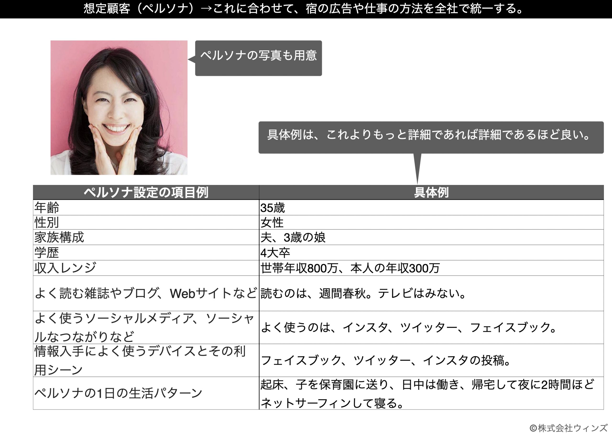 - ペルソナは企業にとって理想的な顧客像です。まずはこれを作りましょう。