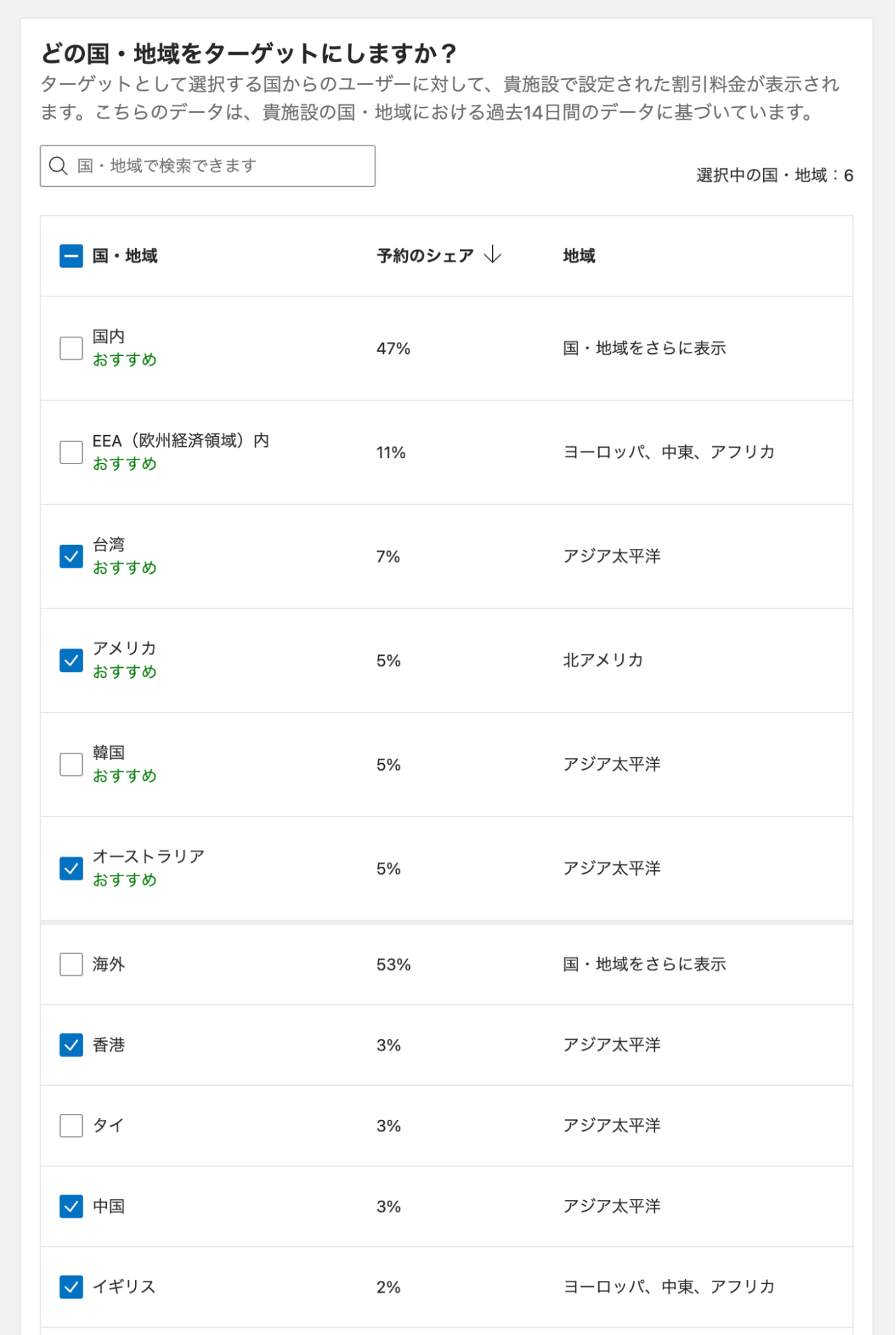 Booking.comの場合、英語圏と中国語圏に絞って早割を設定できます。