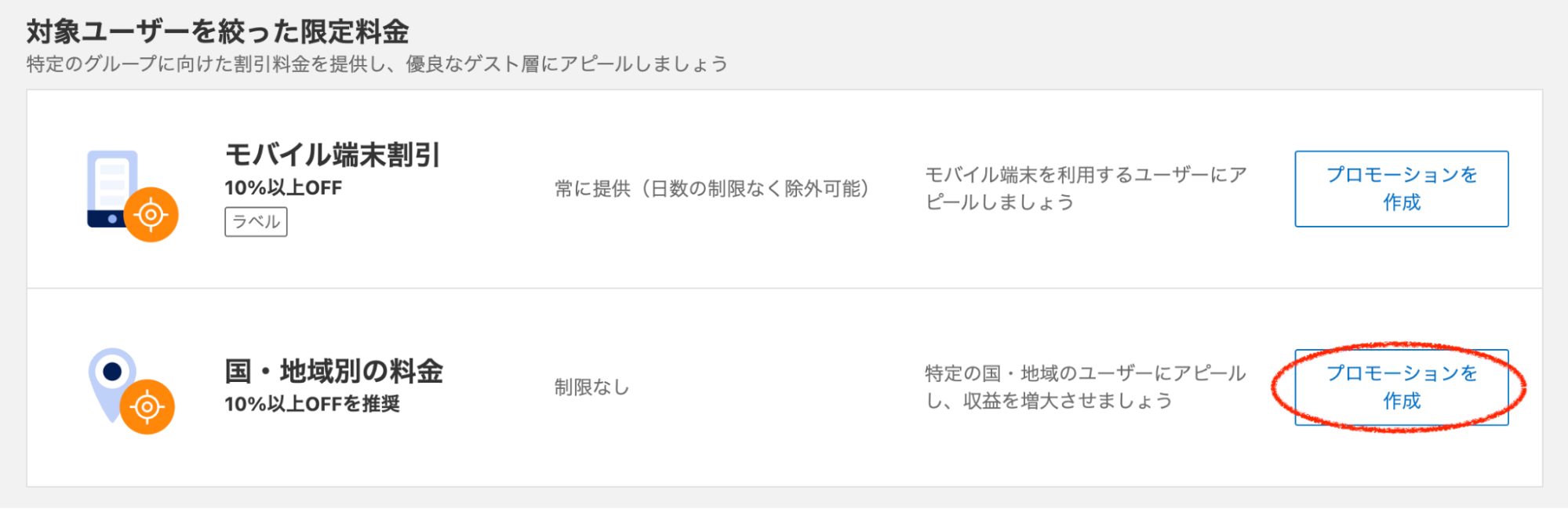 ①プロモーション設定画面で、『国・地域別の料金』をクリック