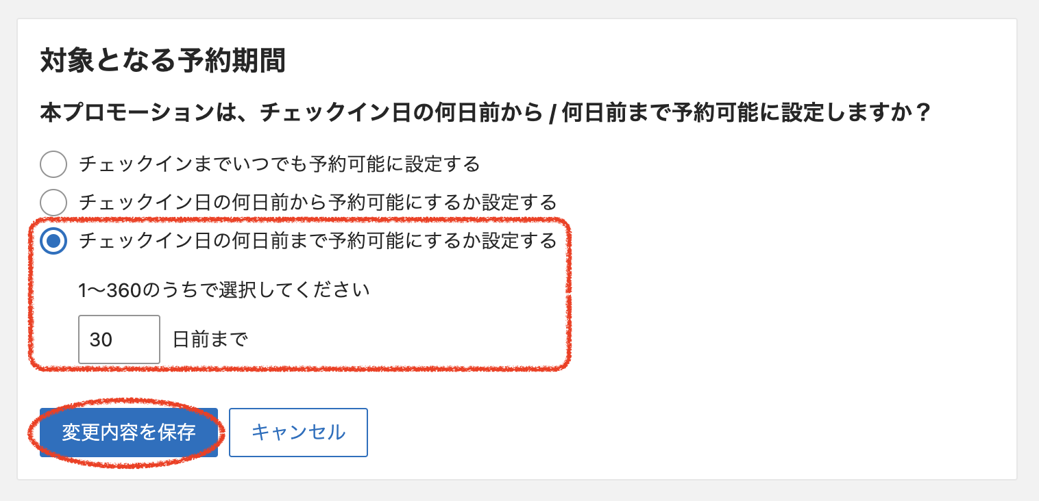 ④チェックインの〇〇日以上前まで予約可能に設定して保存