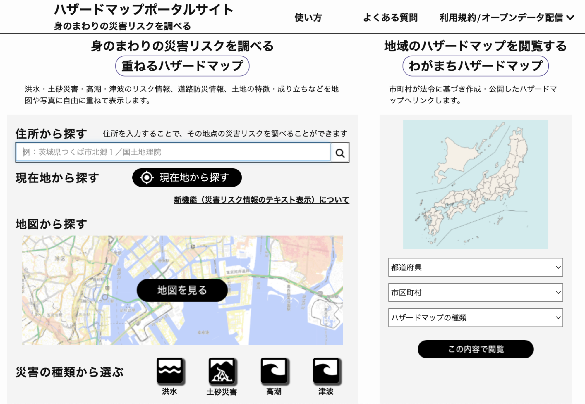 住所を入力するだけで、何の災害に巻き込まれやすいか一目で分かります。