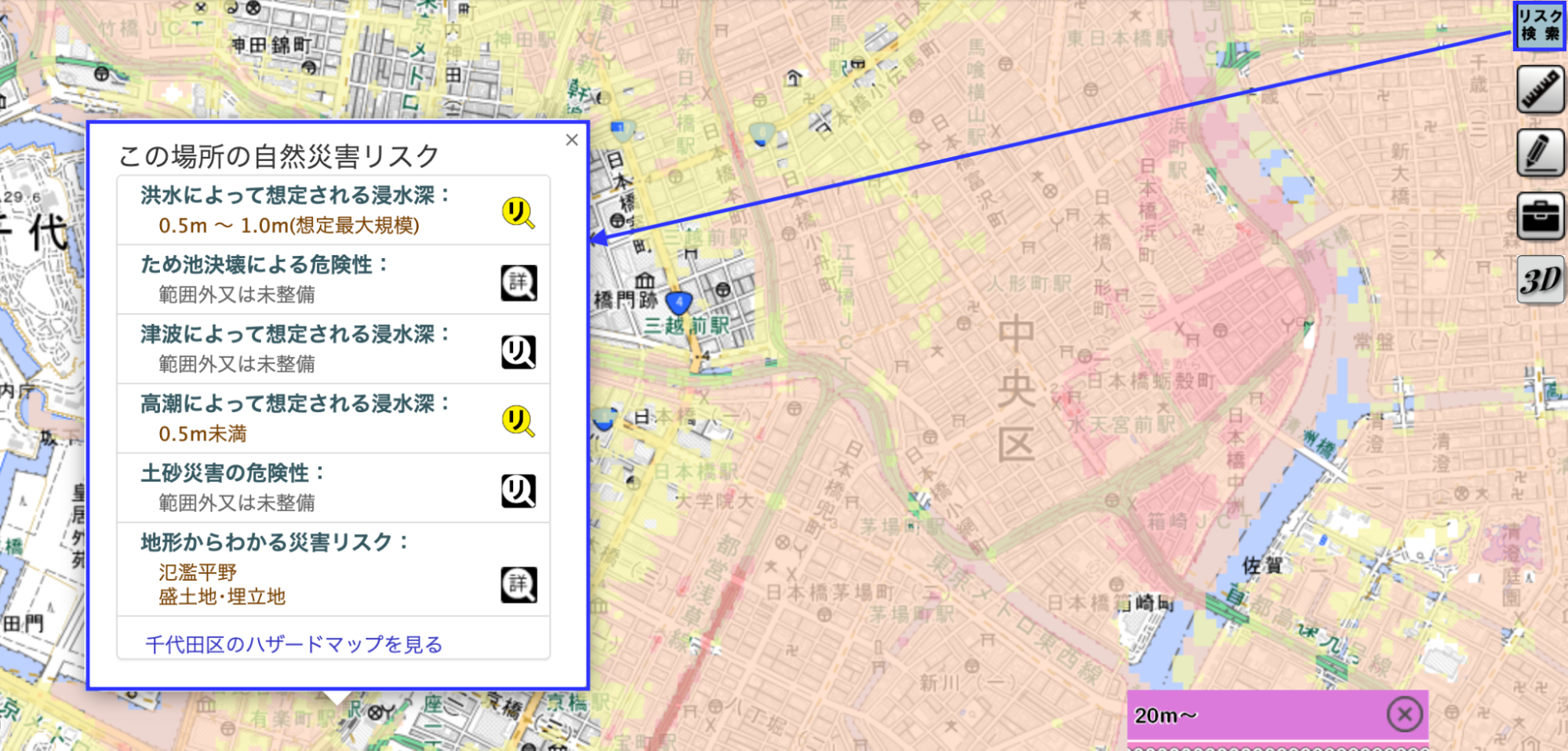 また、リスク検索を押すと施設周辺の災害リストを確認できます。
