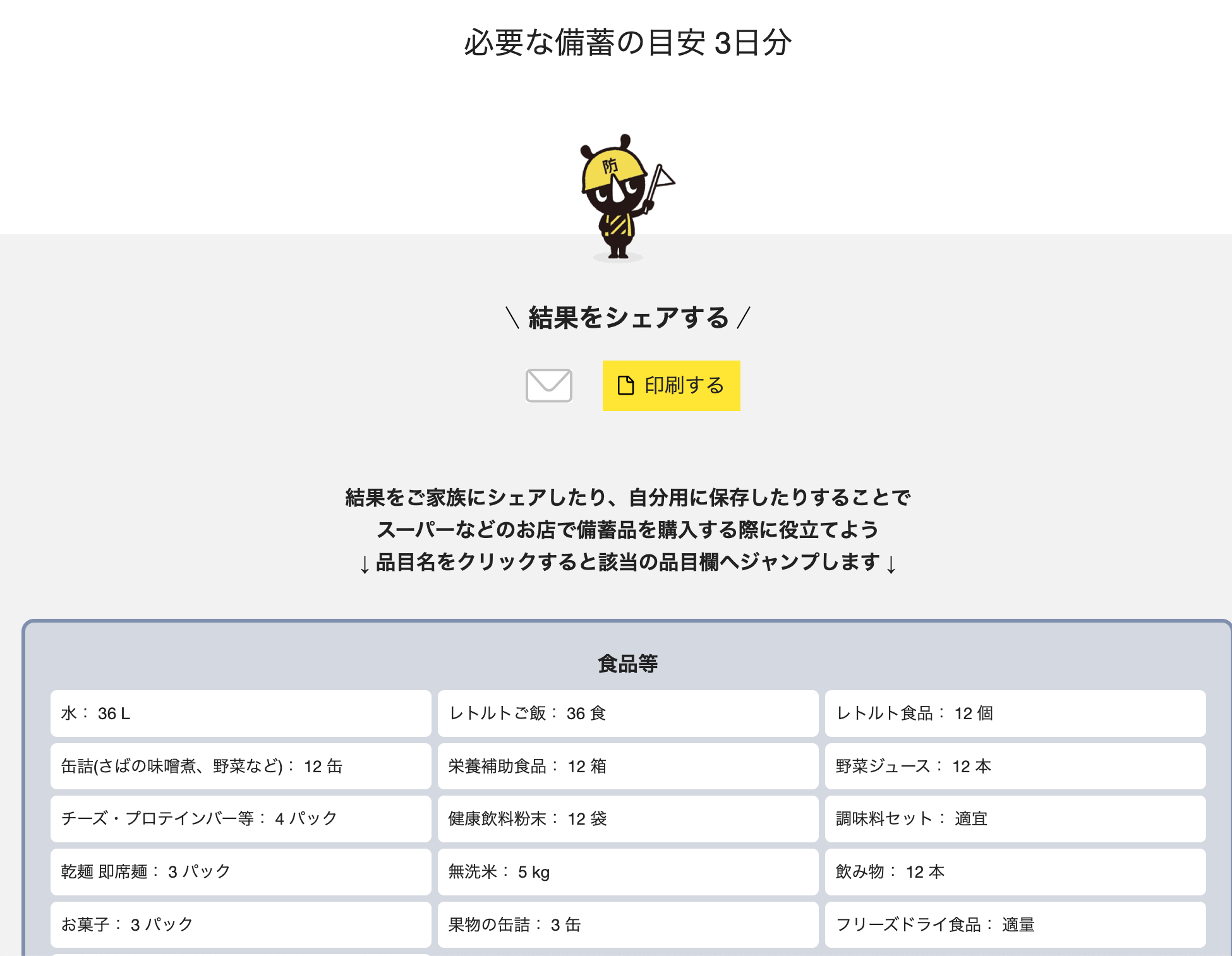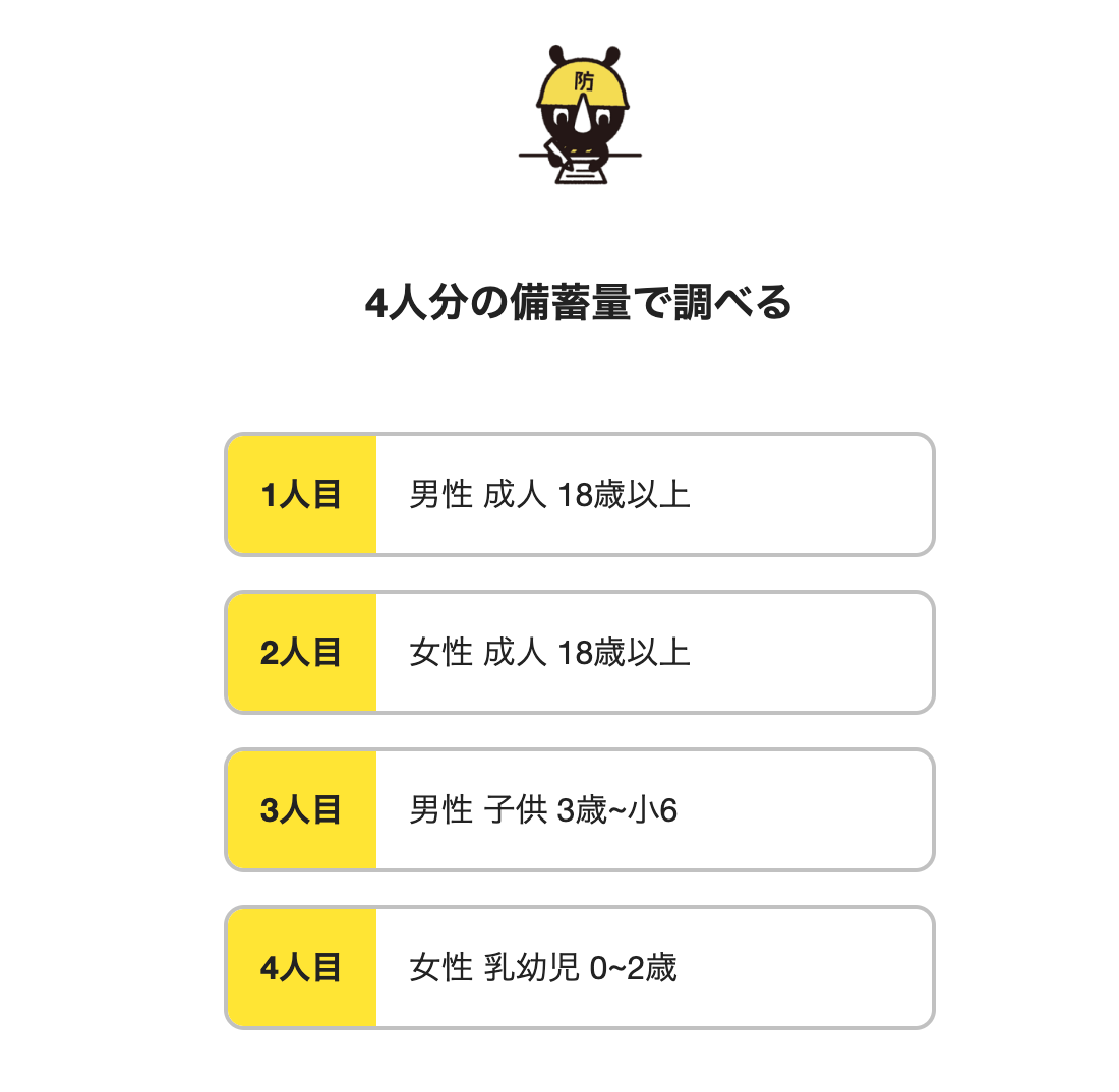 人数や性別を入力すると、必要な備蓄品を3日分教えてくれます。